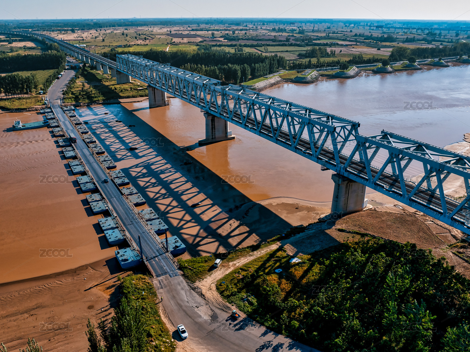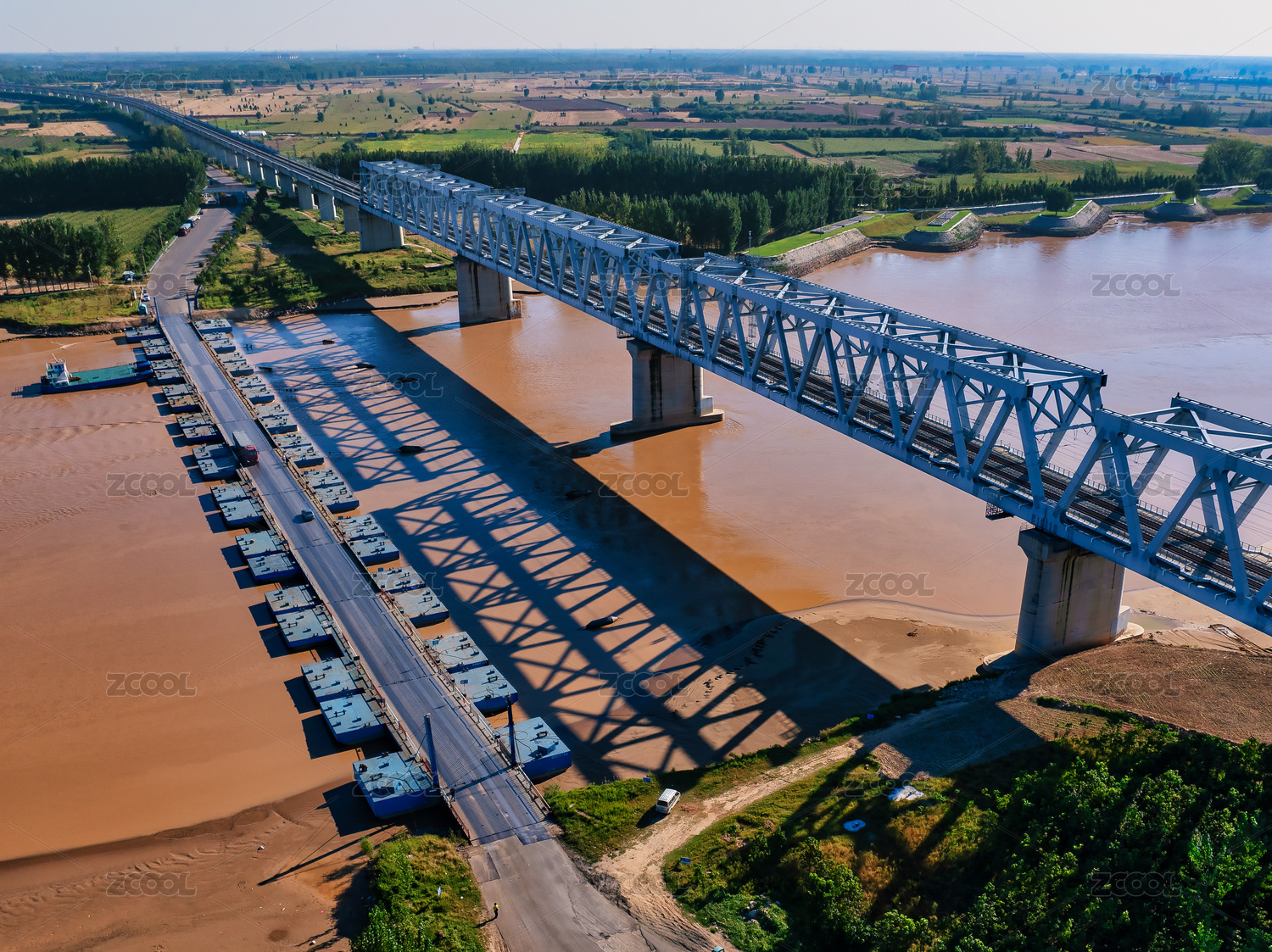 白晝航拍黃河浮橋和鐵路橋