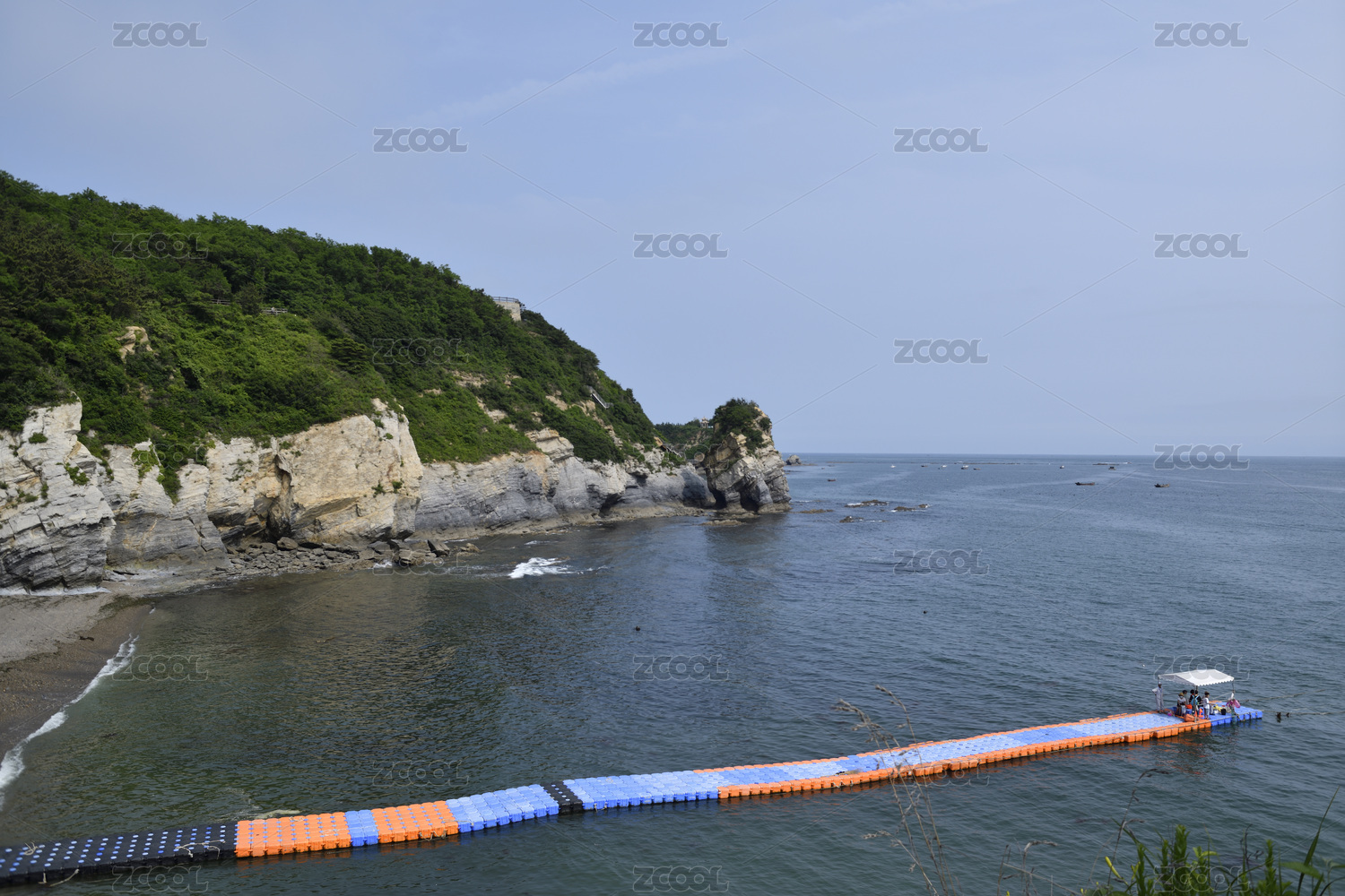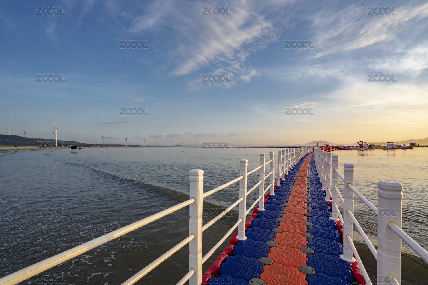 日出時福建東山海面上一座帶護欄的塑料浮橋