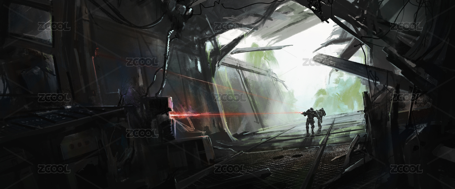 兩個(gè)士兵進(jìn)入墜落在叢林中的不明飛船