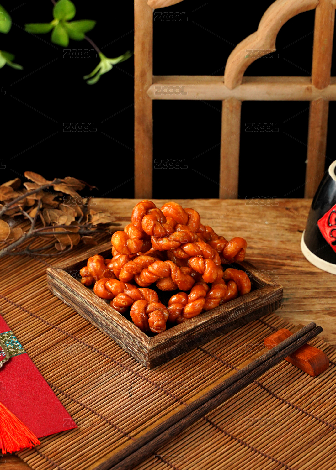 桌面上的木盤子里美味可口的紅糖麻花
