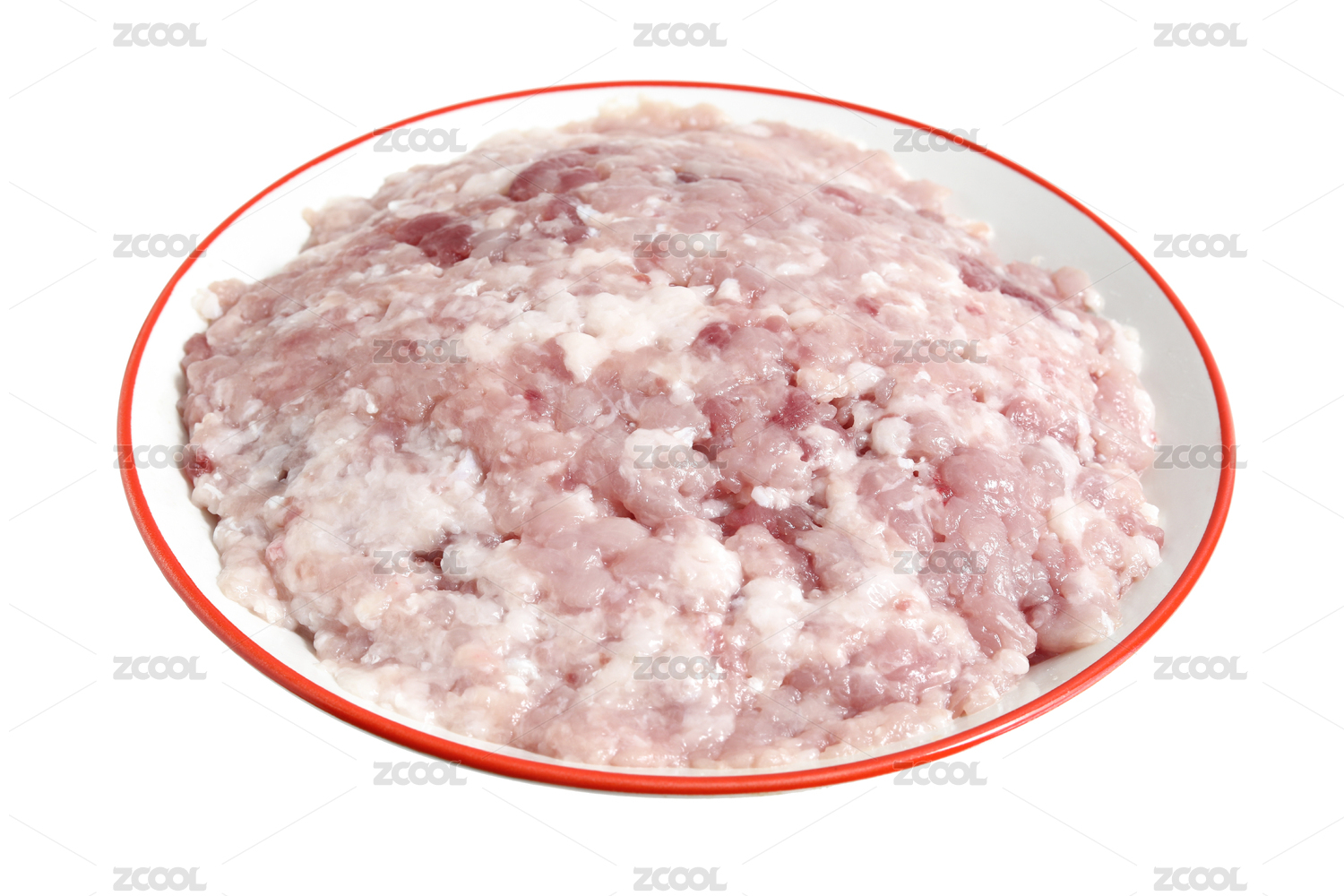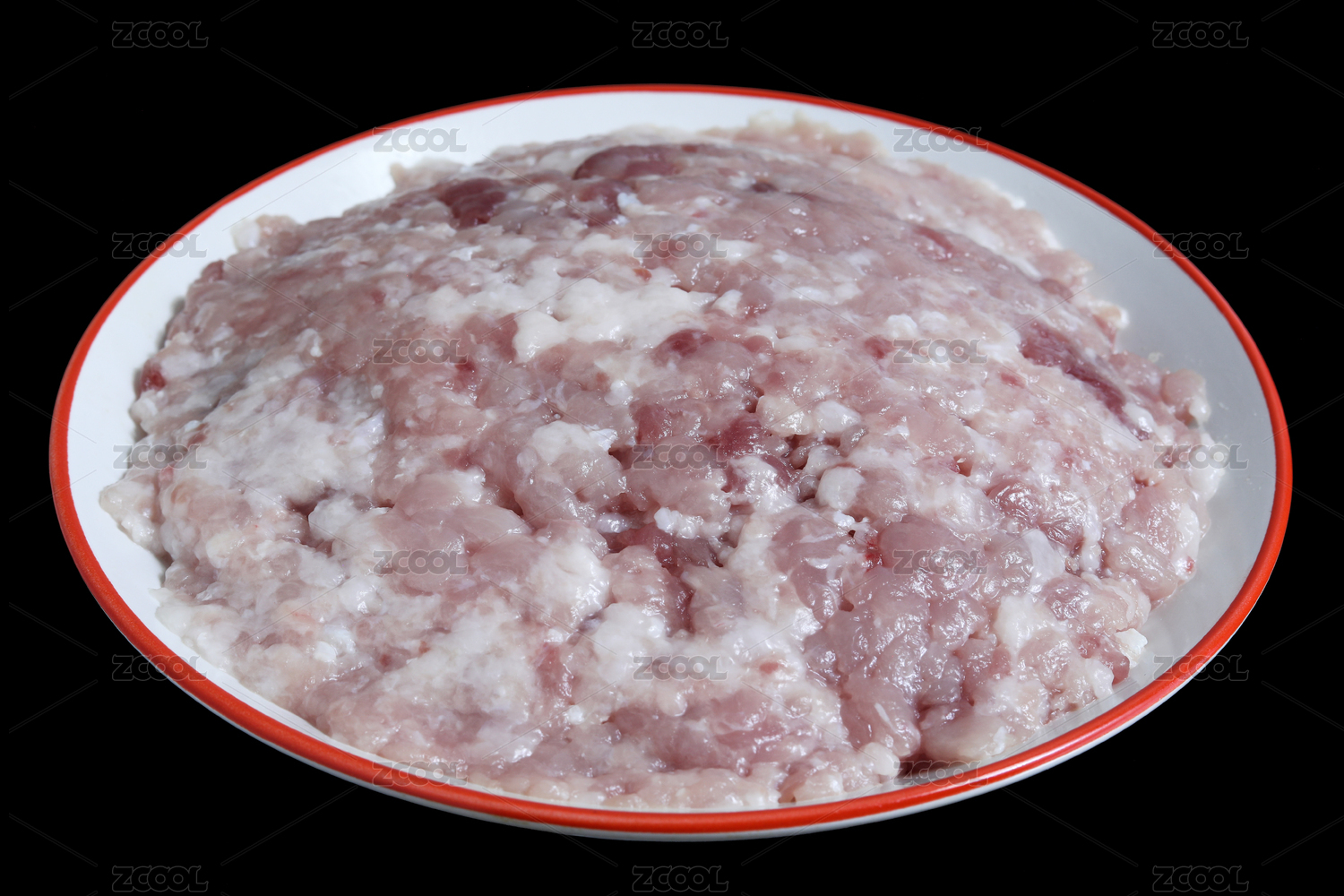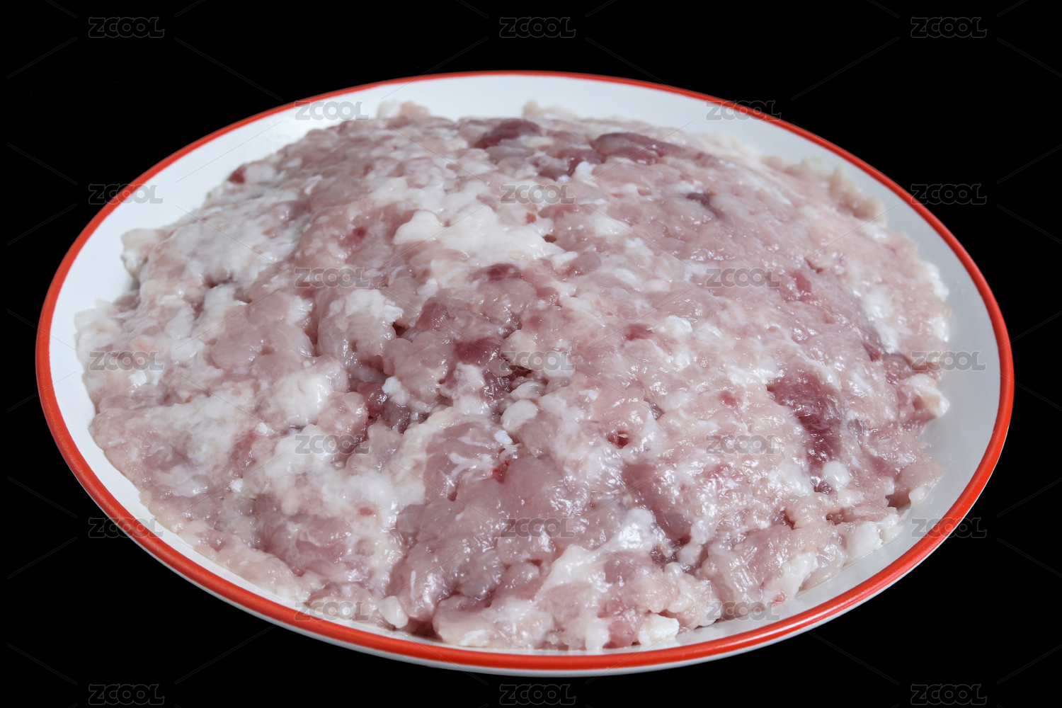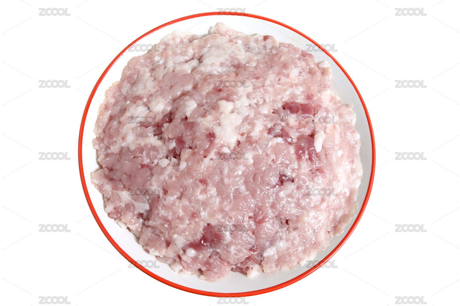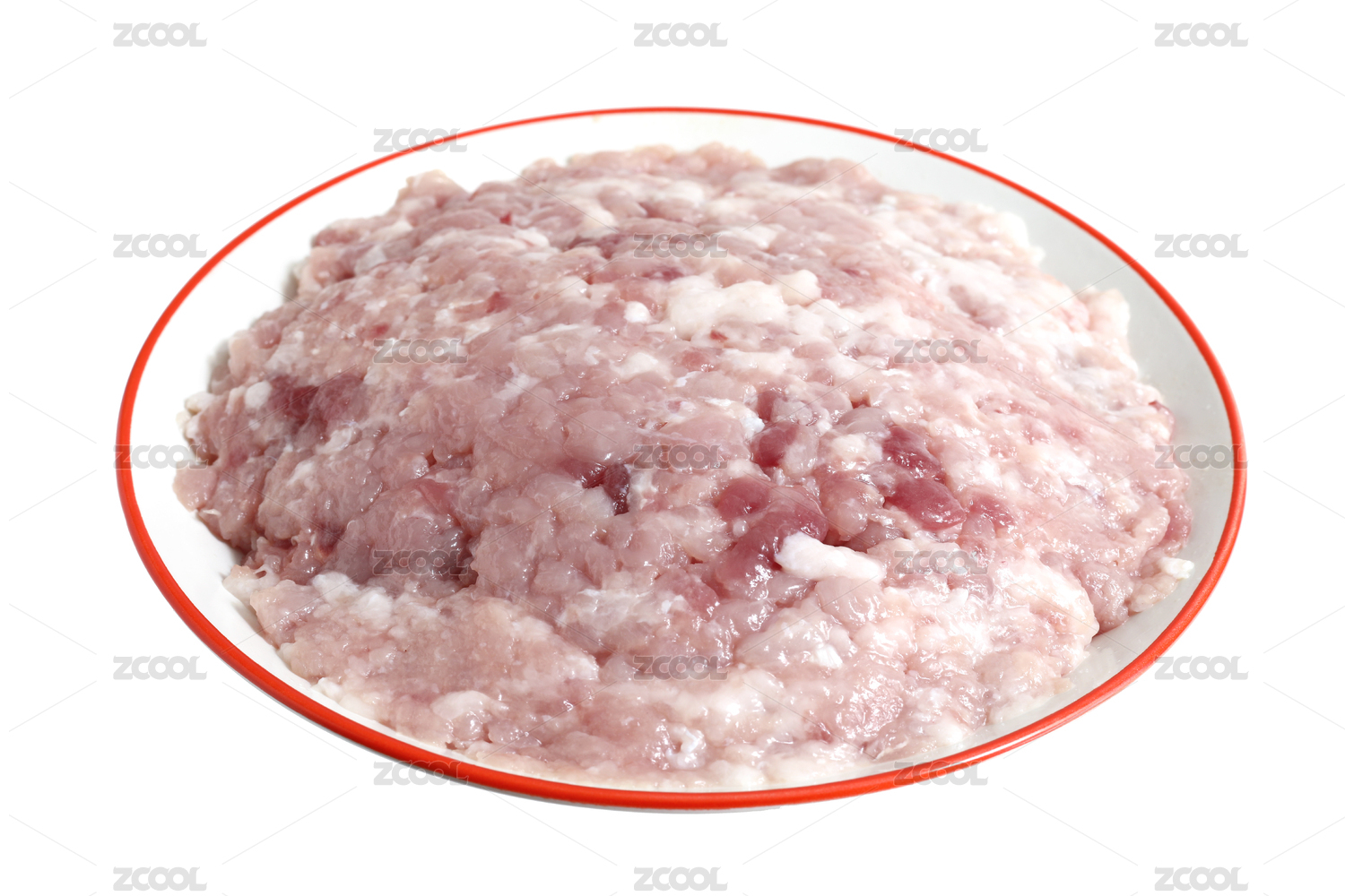 紅色桌面上的一盤子新鮮食材豬肉餡肉末
