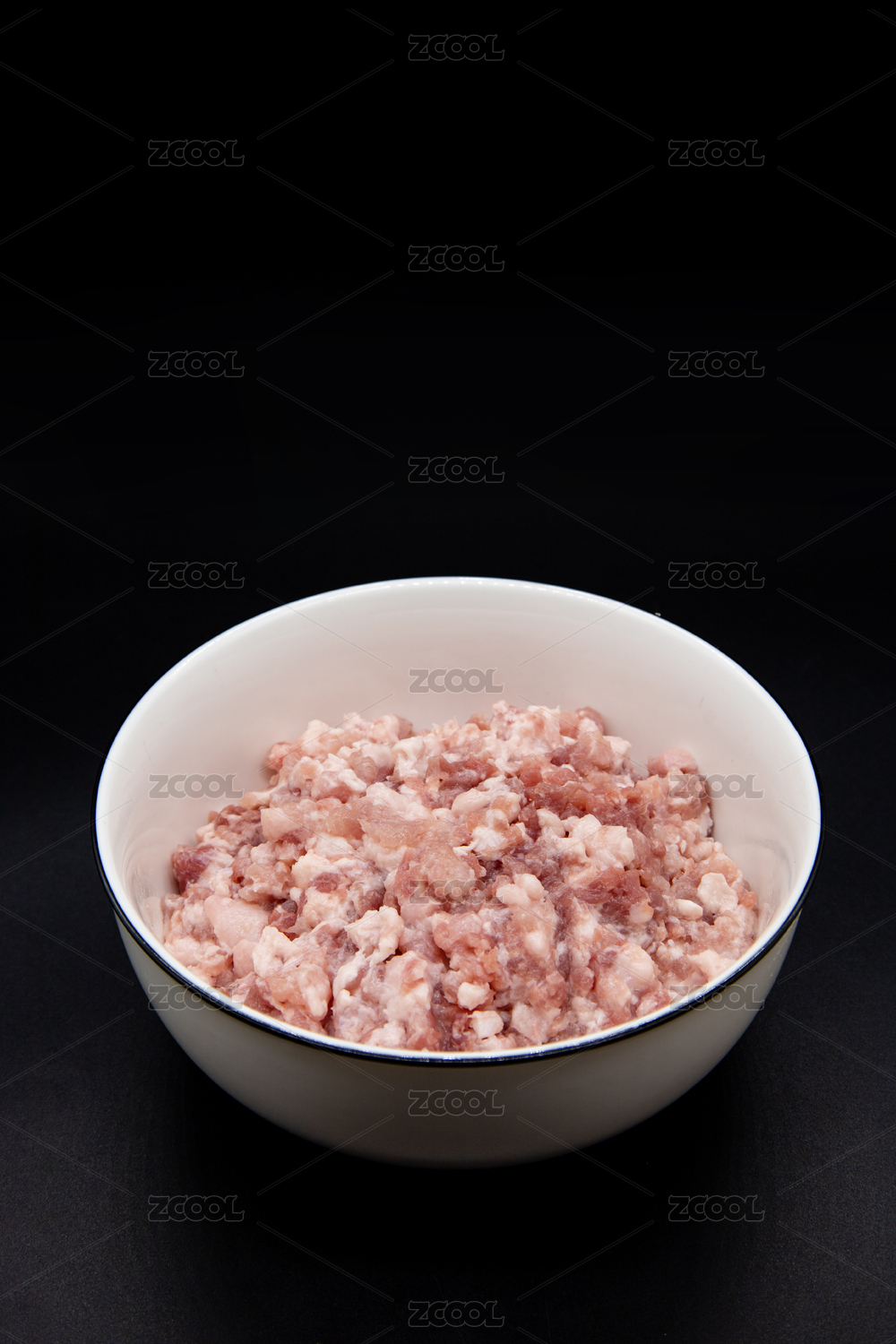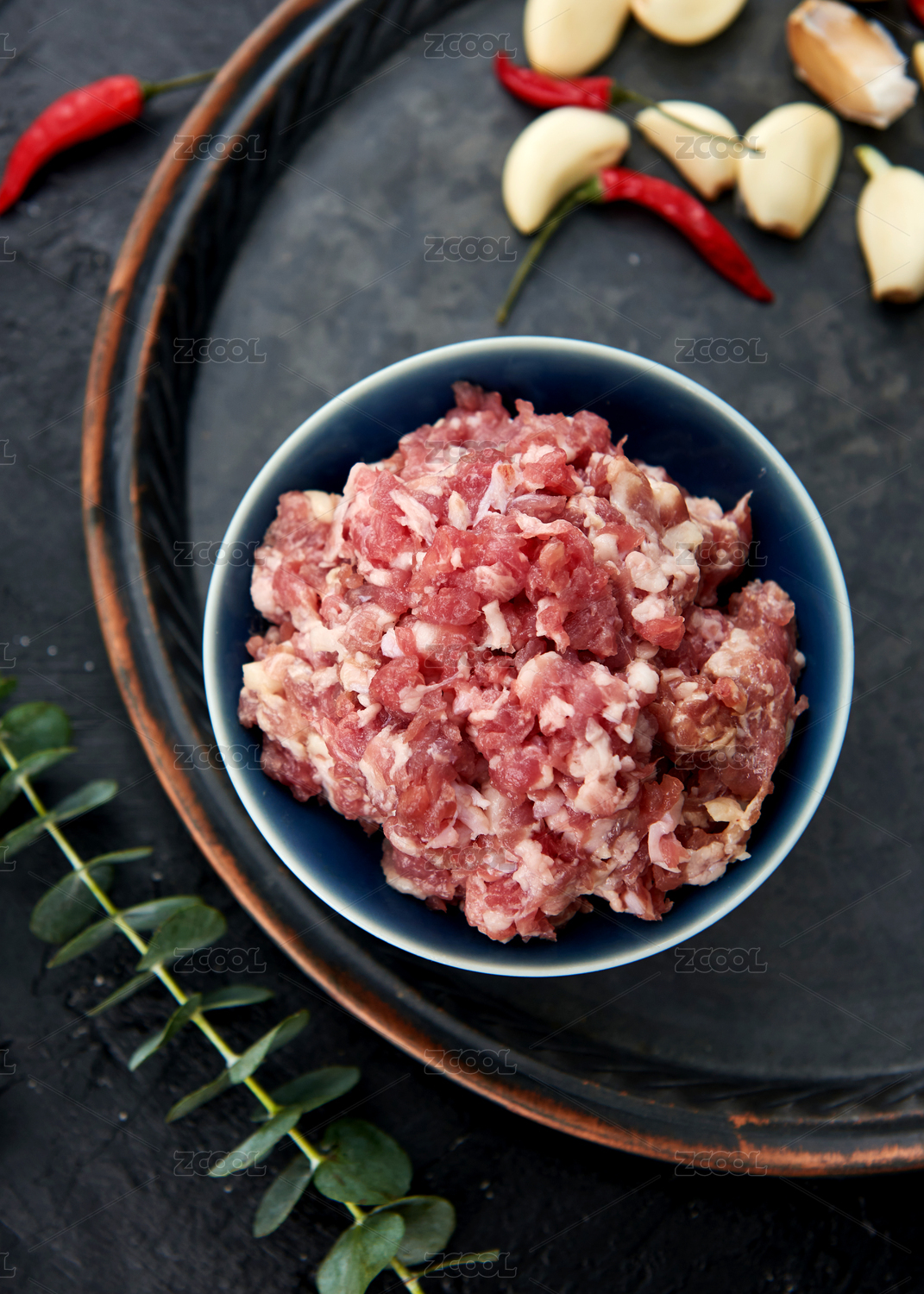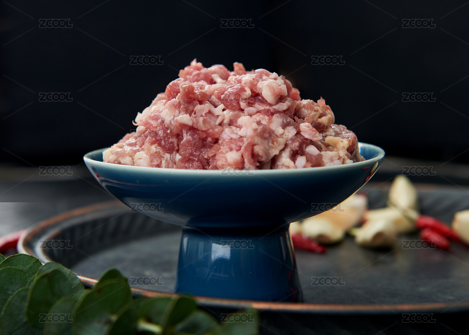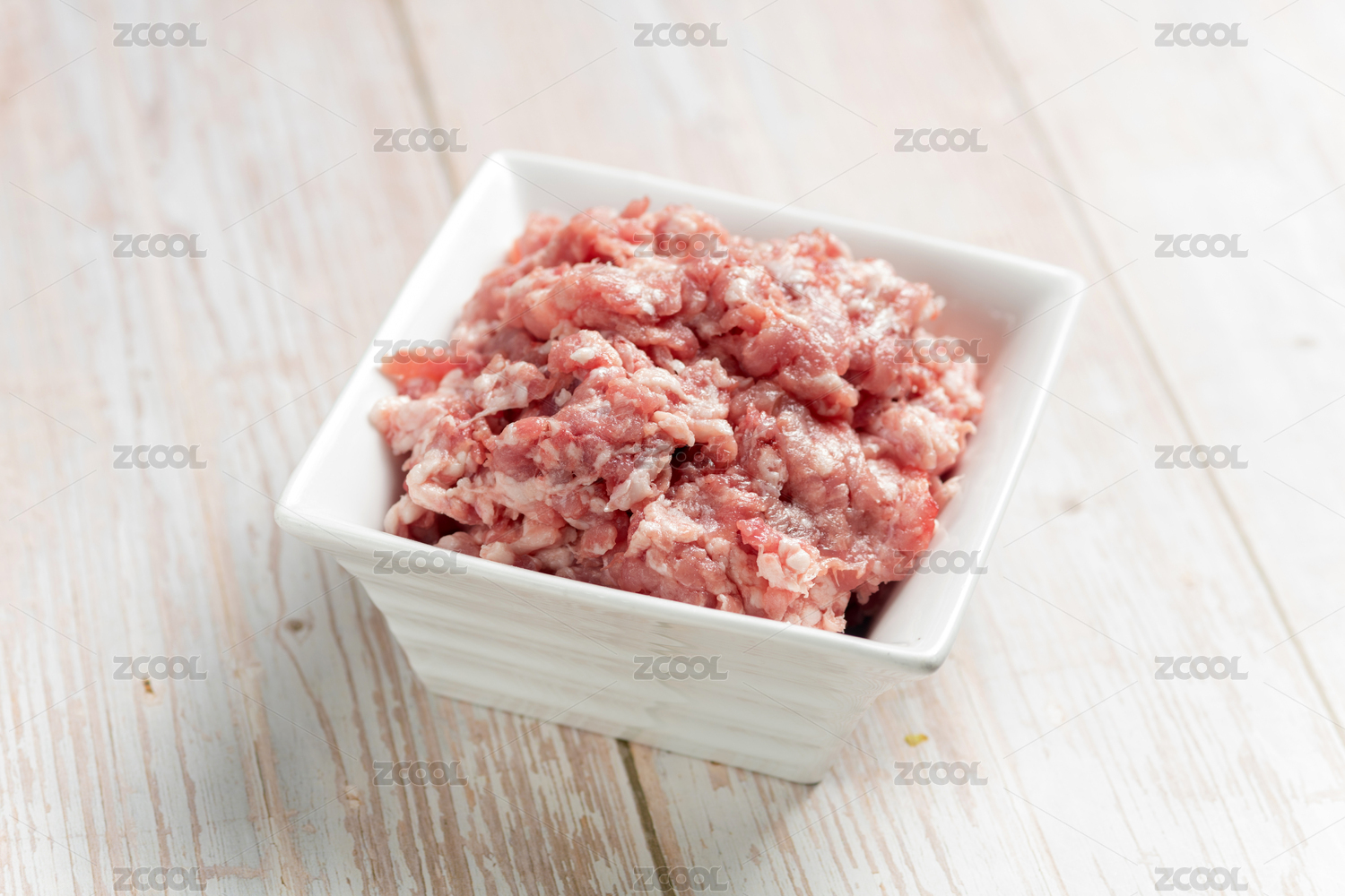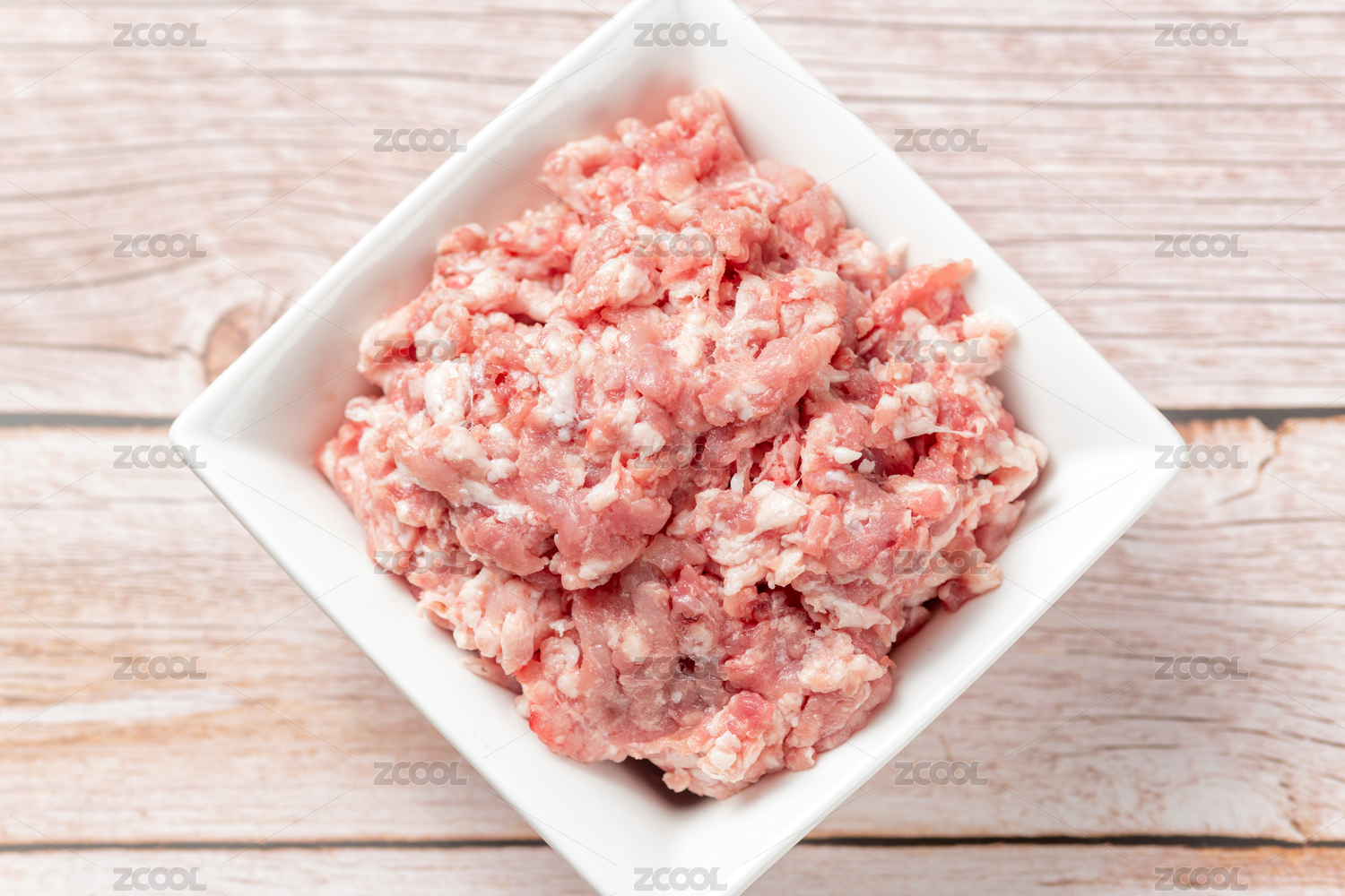 紅色桌面上的一盤子新鮮食材豬肉餡肉末