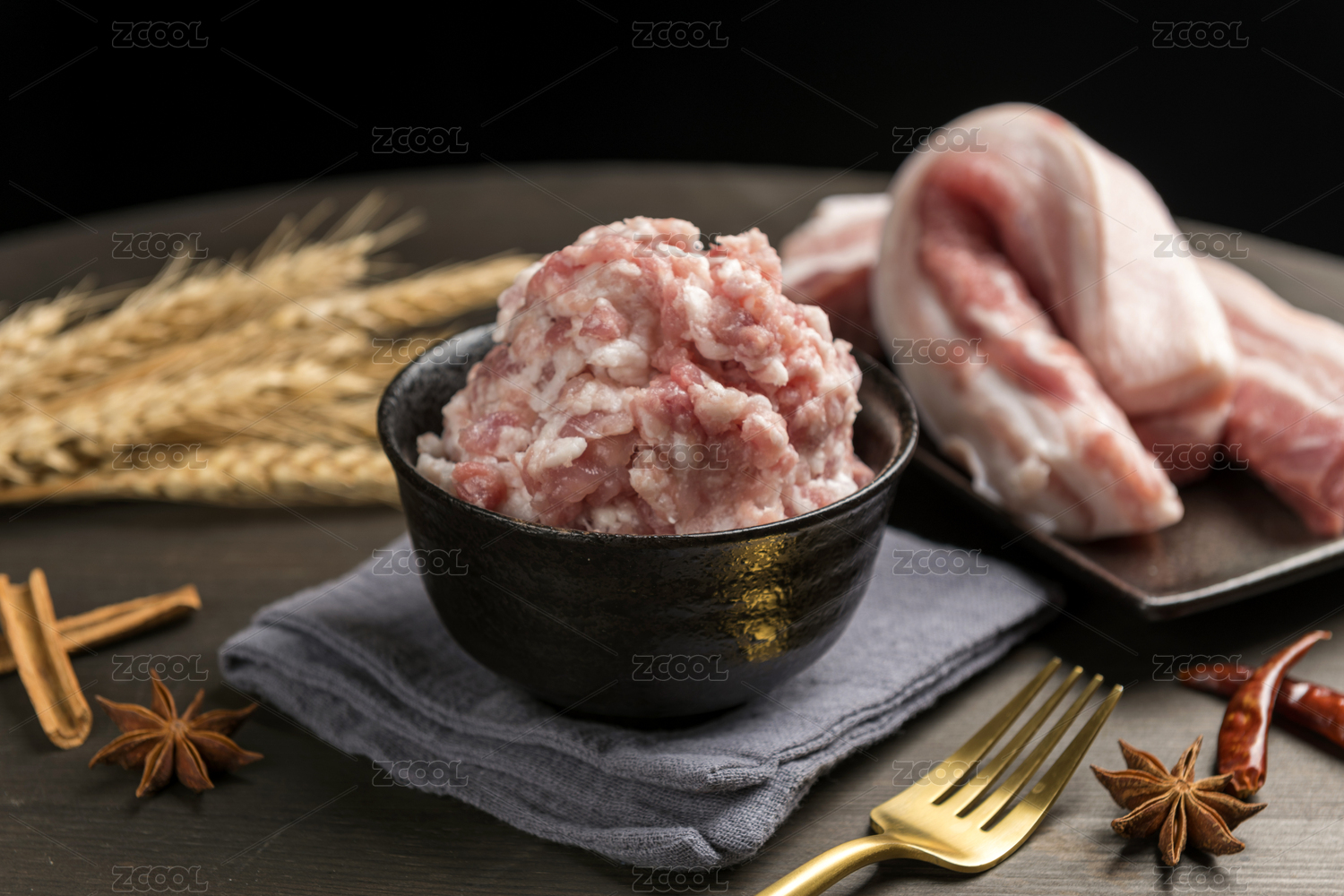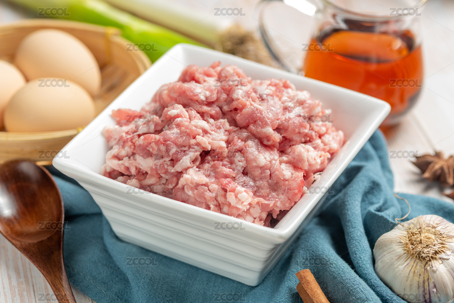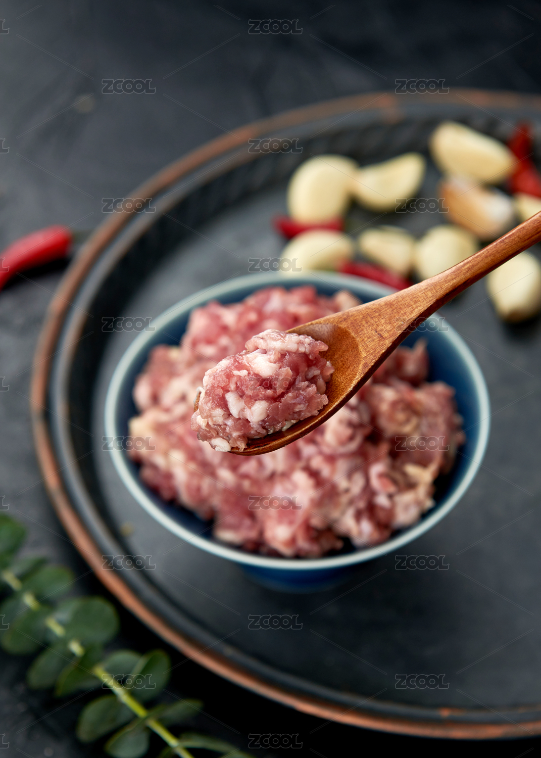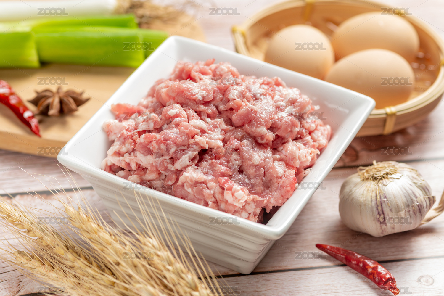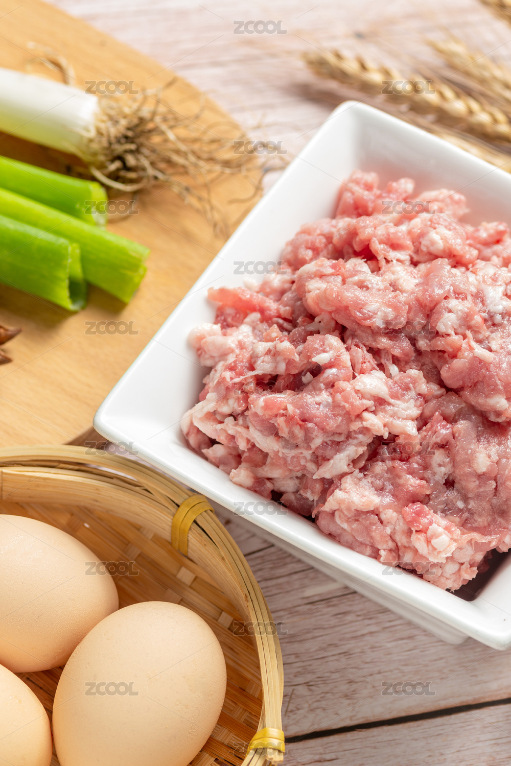 新鮮的豬肉餡擺放在木桌面上旁邊放有調(diào)料
