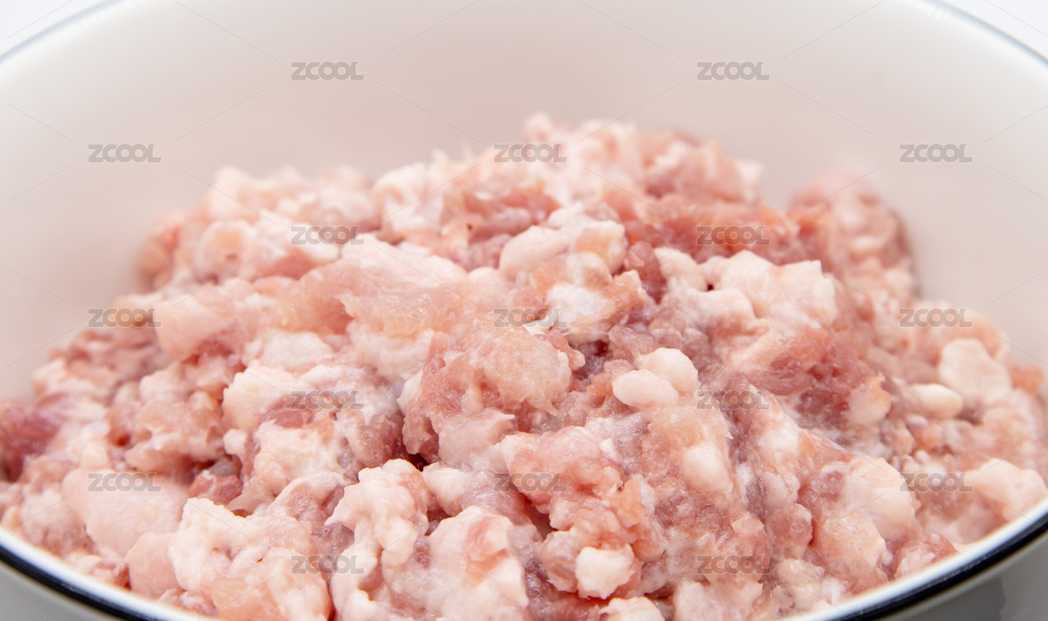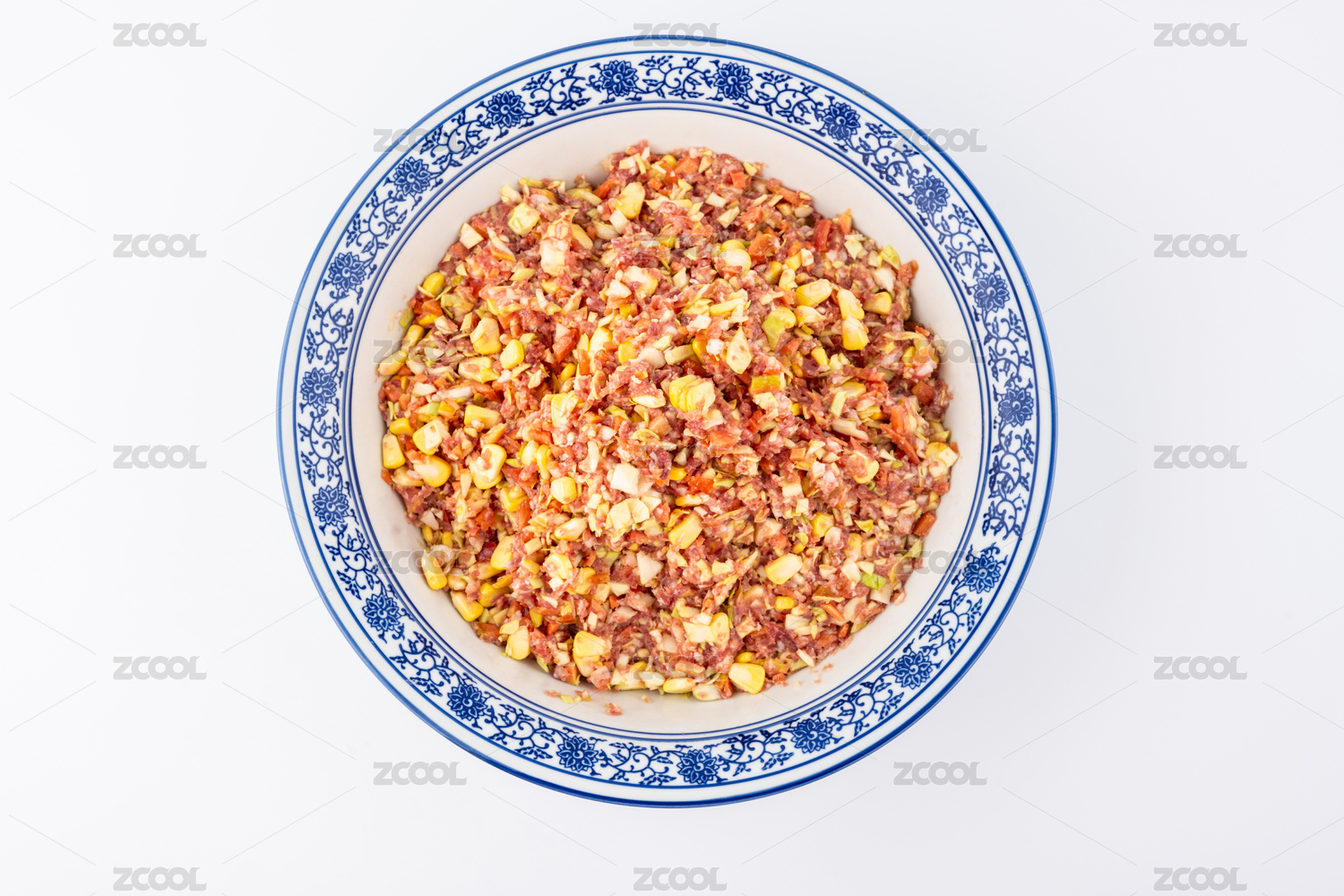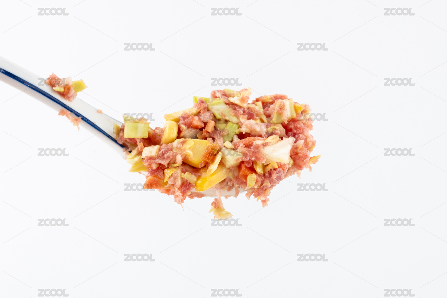 一盤子新鮮食材豬肉餡餃子餡特寫的白底圖