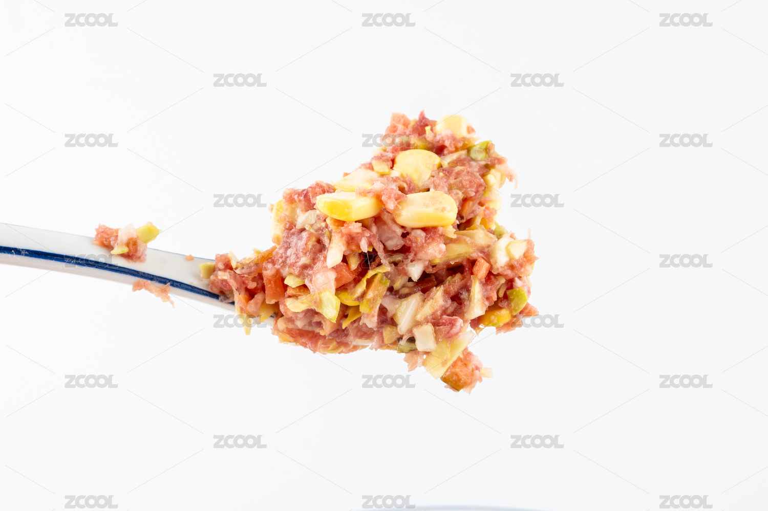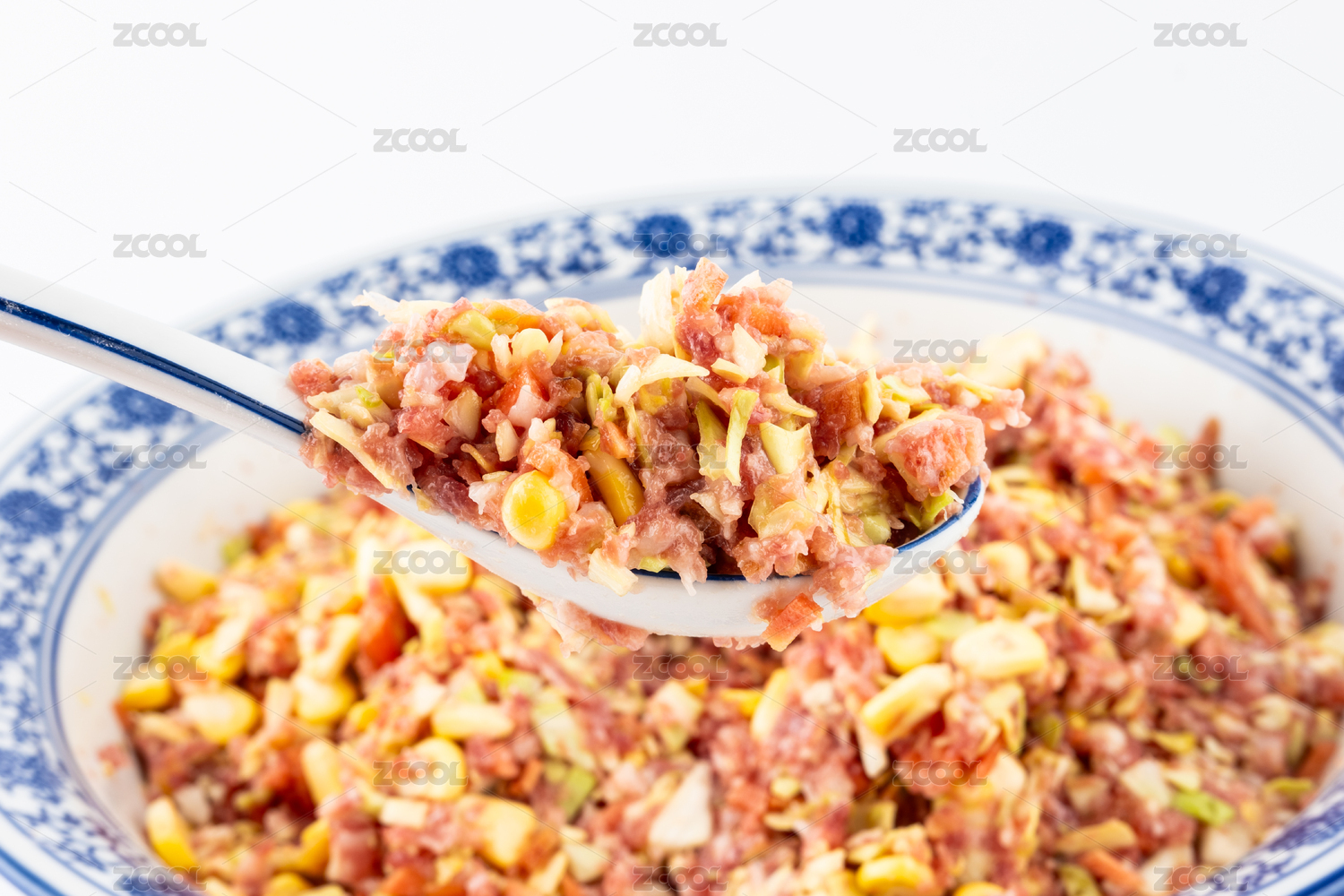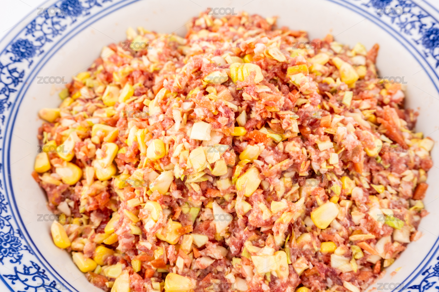 一盤子新鮮食材豬肉餡餃子餡特寫的白底圖