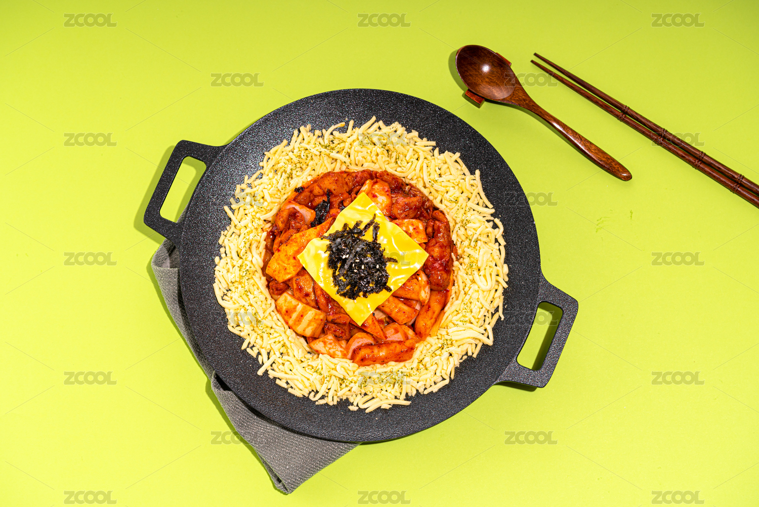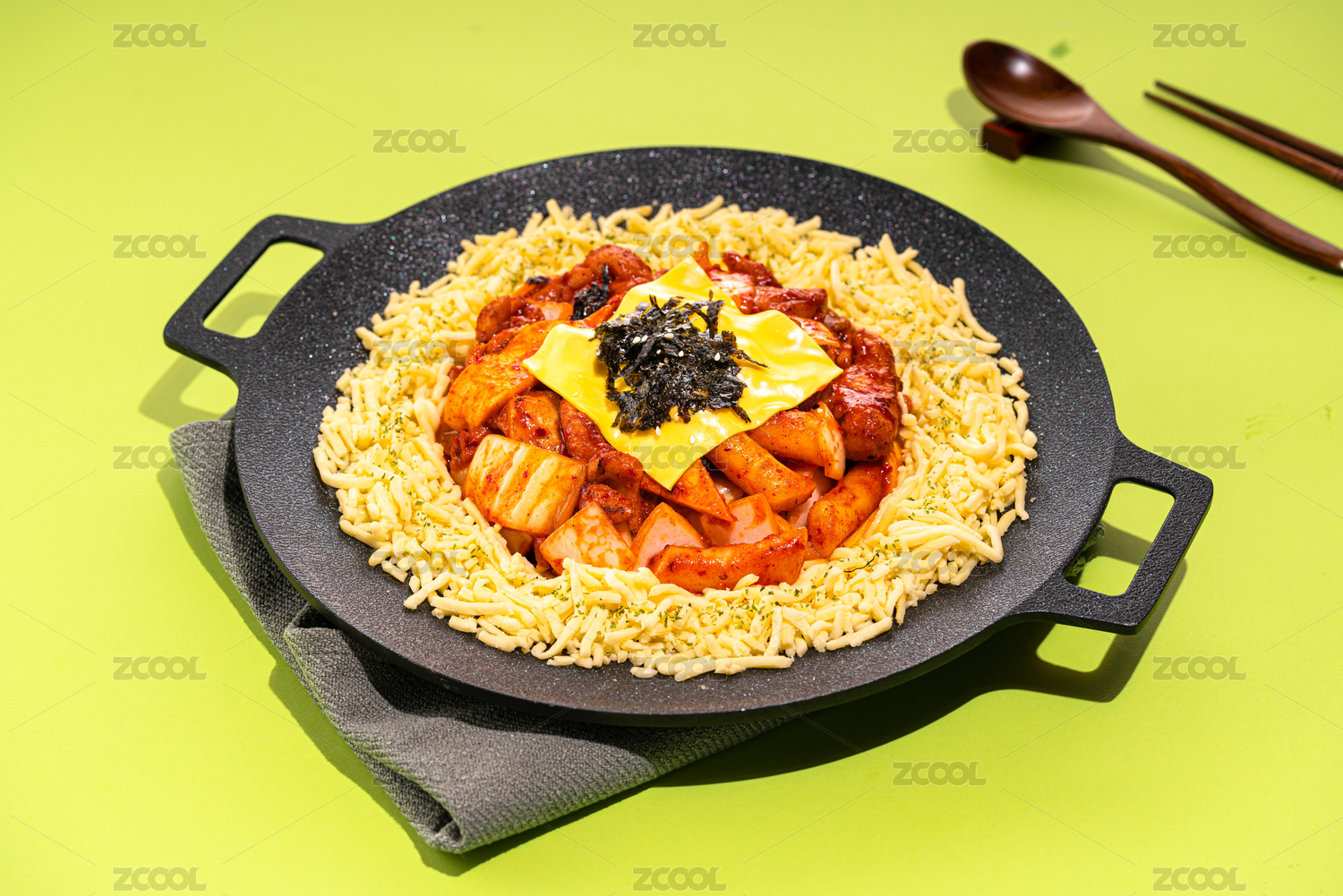 放在鐵鍋里的韓國(guó)料理芝士辣炒雞丁