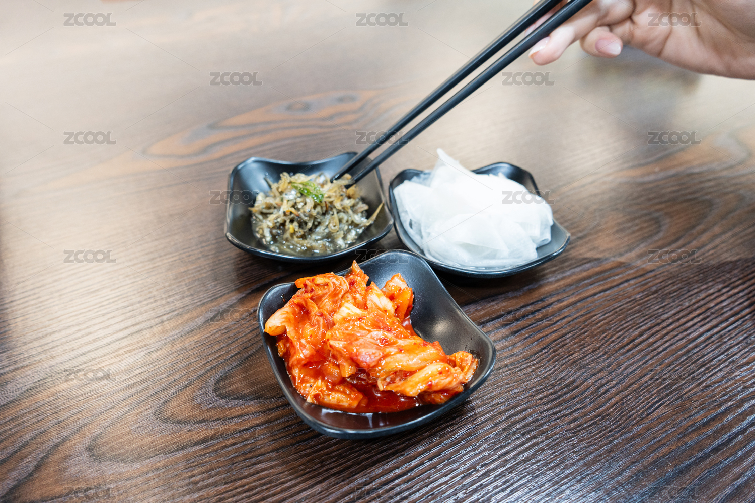 韓國(guó)料理餐廳桌子上的魚(yú)干蘿卜辣白泡菜配菜