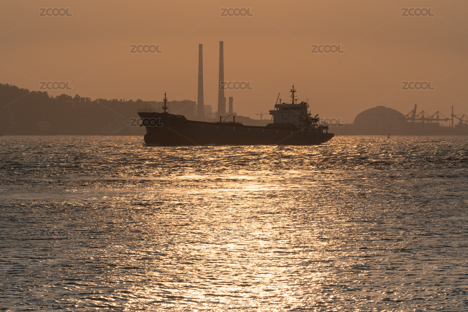 黃昏下航行在江面上的貨船
