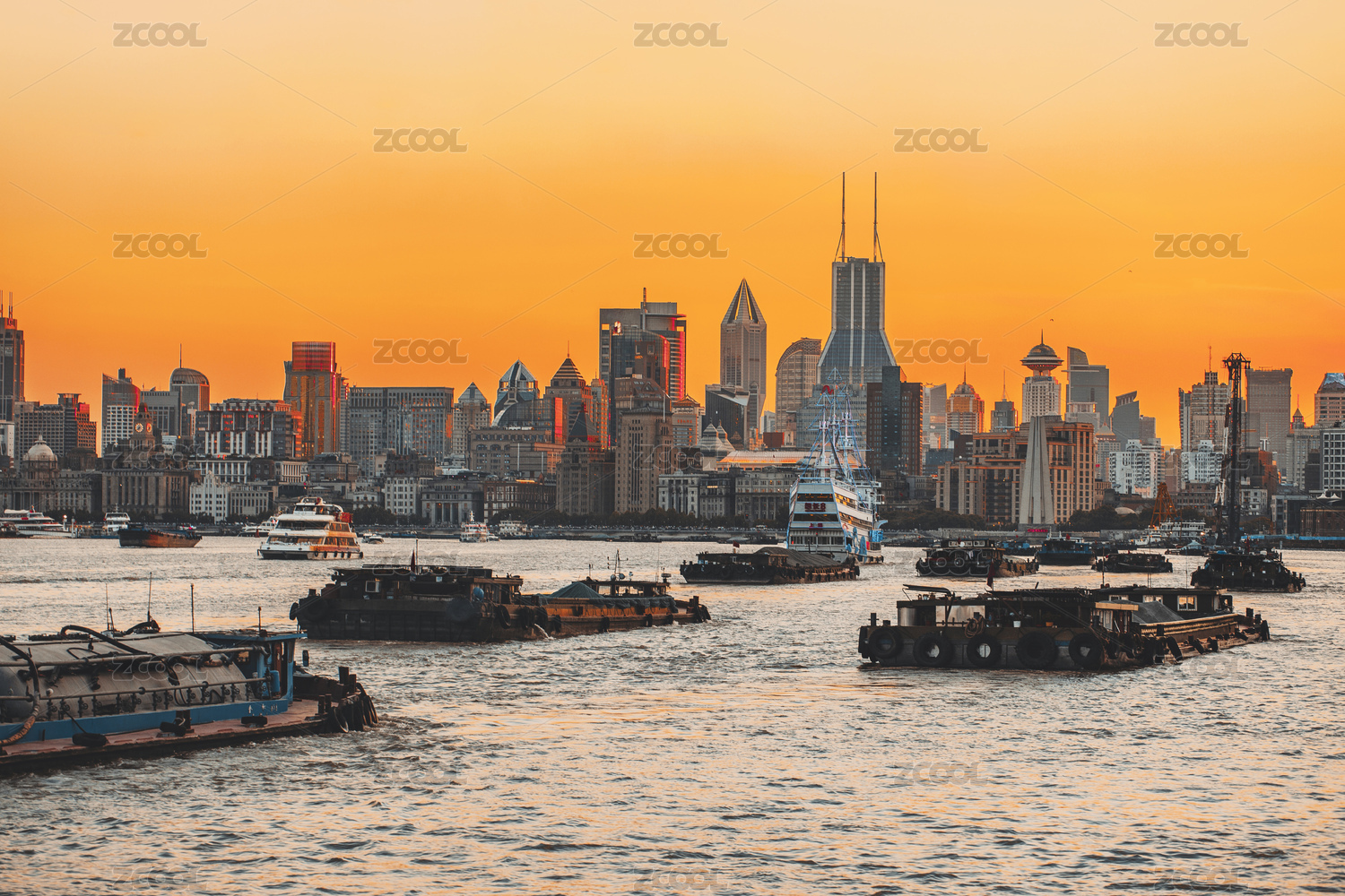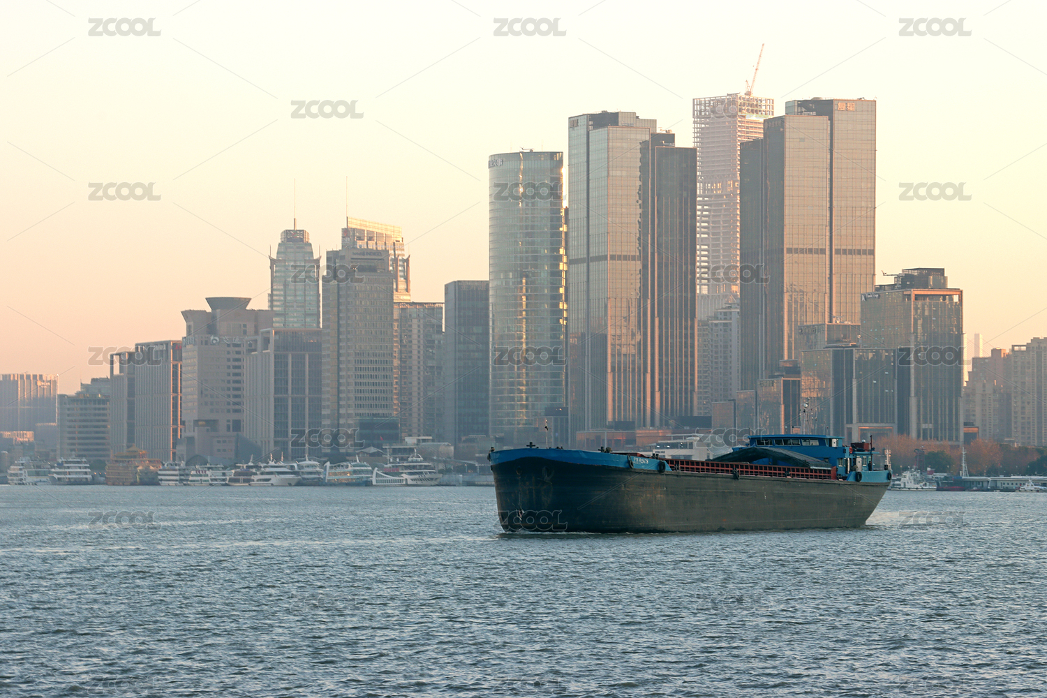 傍晚時(shí)分黃浦江上的貨船和城市建筑