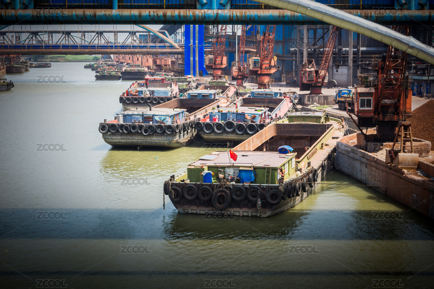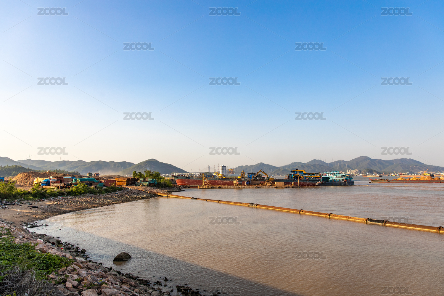 運(yùn)砂土的貨船在港口卸貨作業(yè)