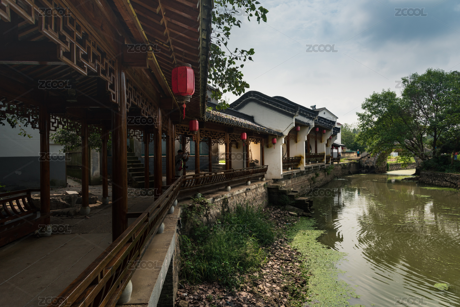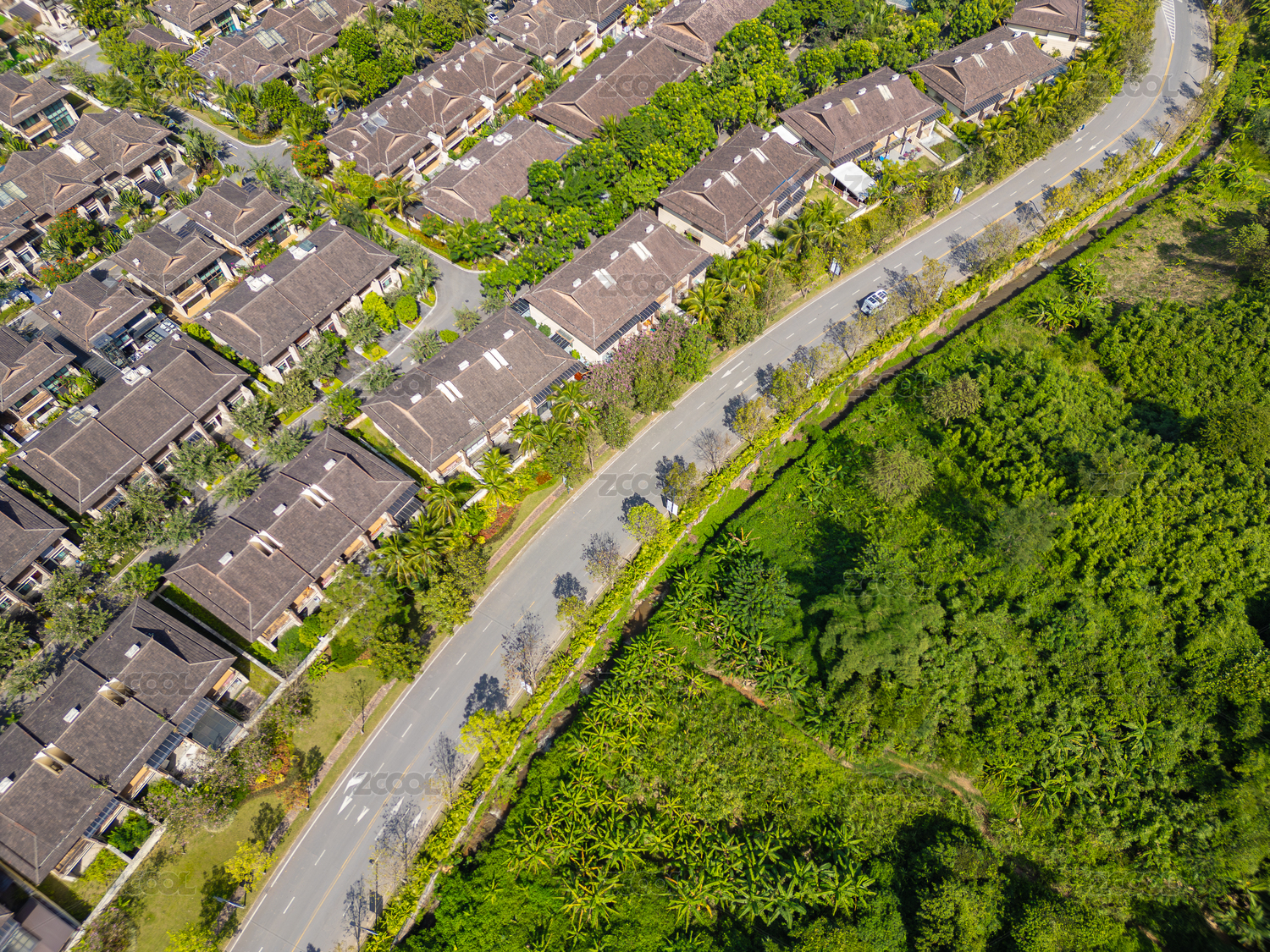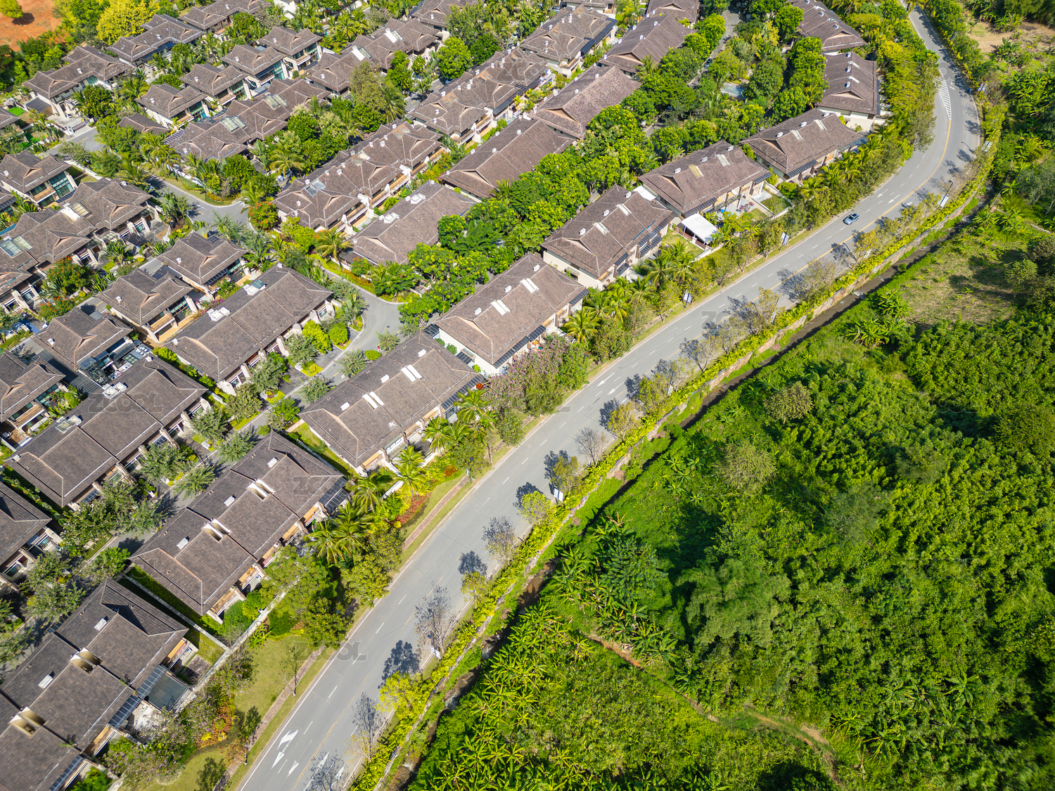 藍天下的綠蔭石徑與碧波中的棕色雅居