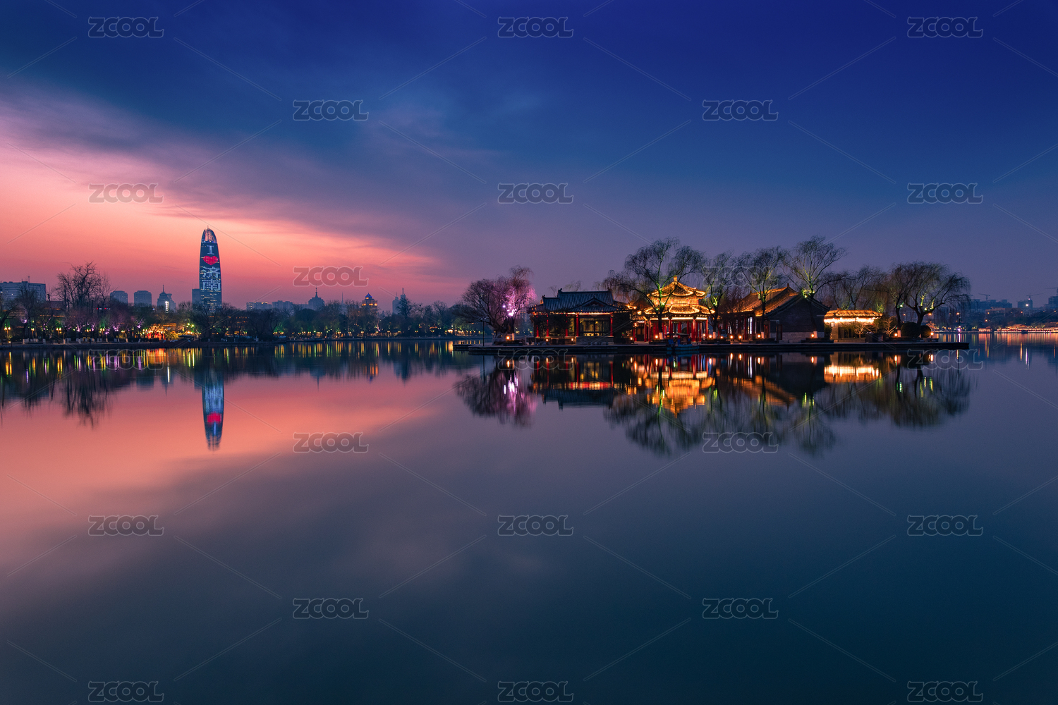 山東濟(jì)南大明湖夕陽(yáng)倒映景觀(guān)
