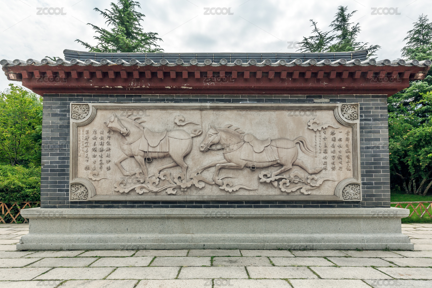 中國(guó)山東省濟(jì)南市五龍?zhí)豆珗@內(nèi)秦瓊祠馬浮雕影壁墻