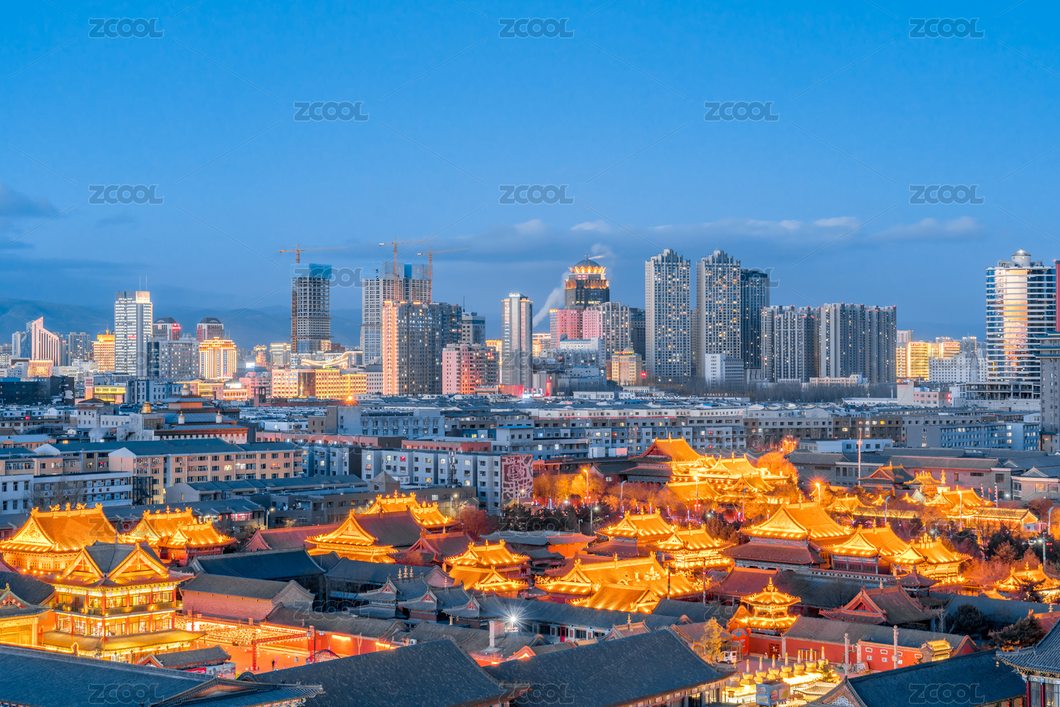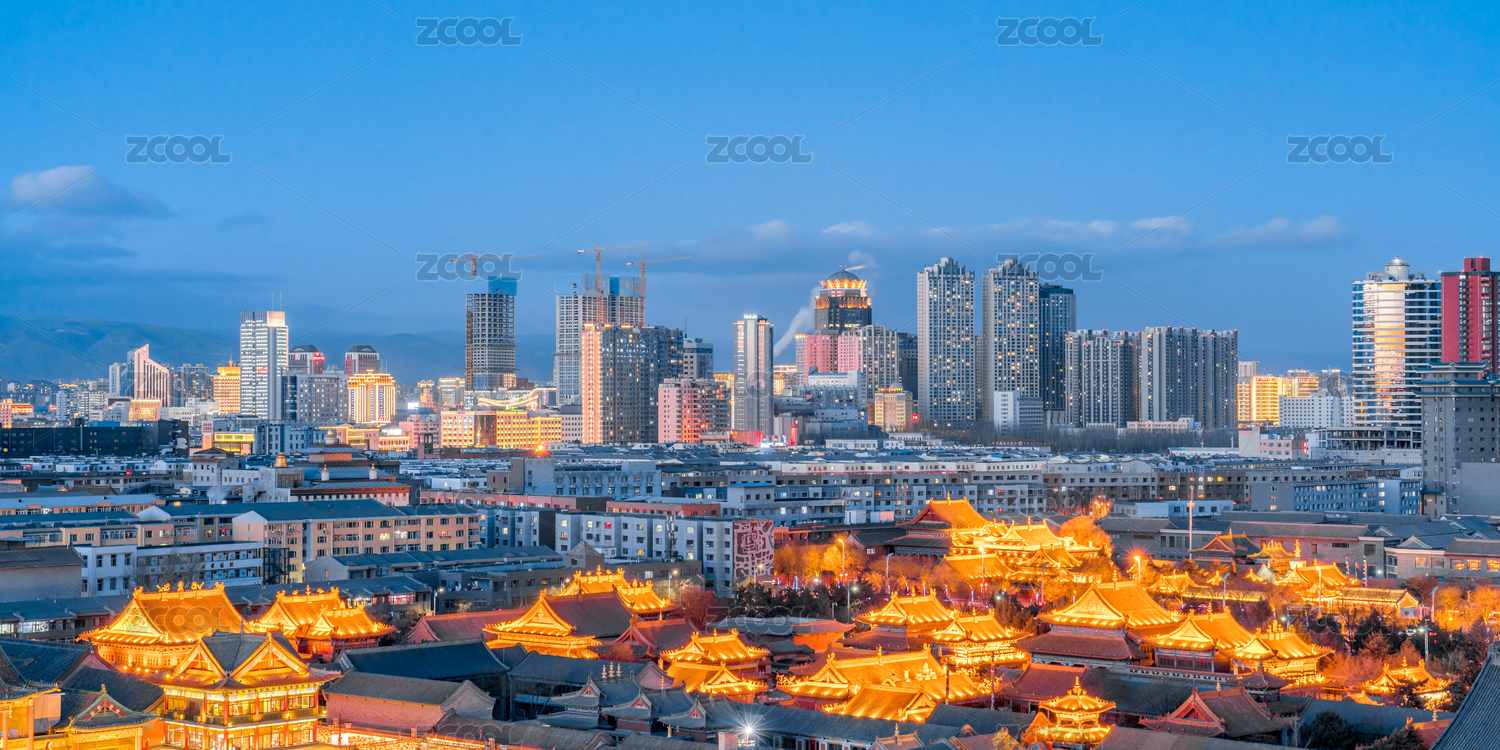 中國(guó)內(nèi)蒙古呼和浩特大召寺和遠(yuǎn)處的高樓夜景