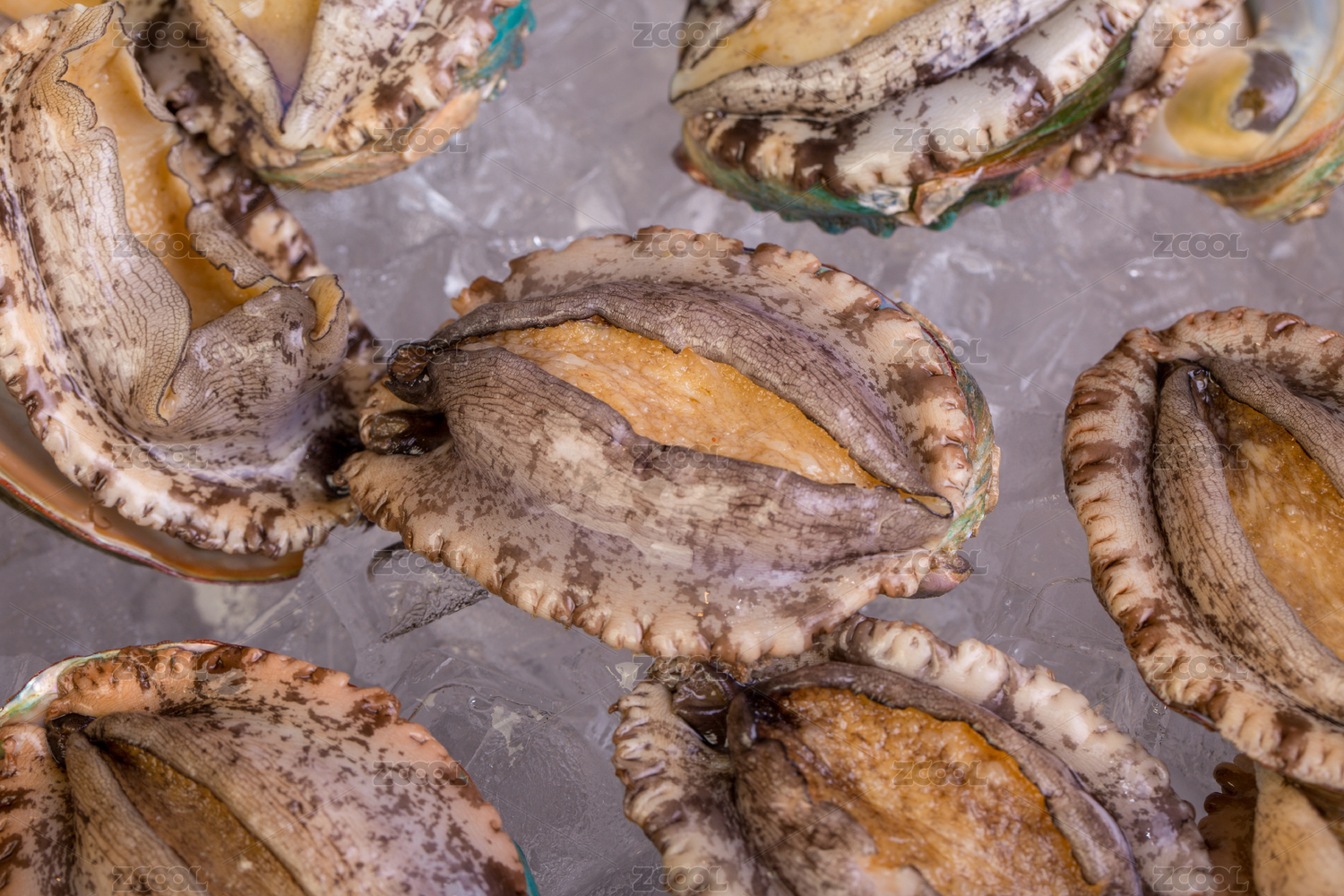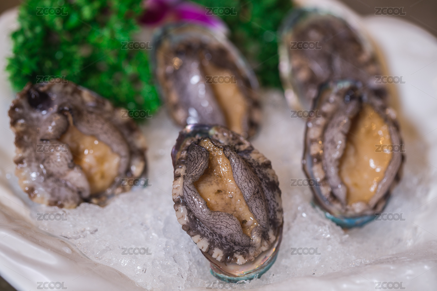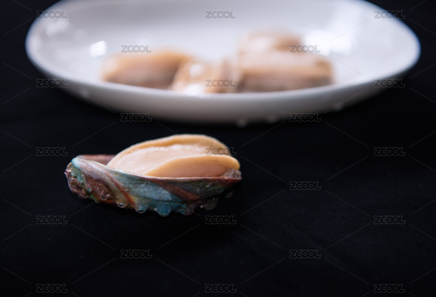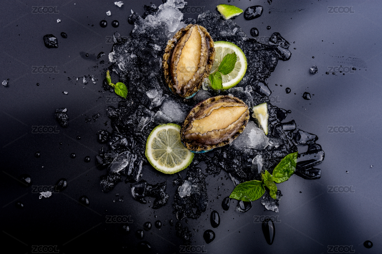黑色背景里的四只濺起水花的鮮活鮑魚