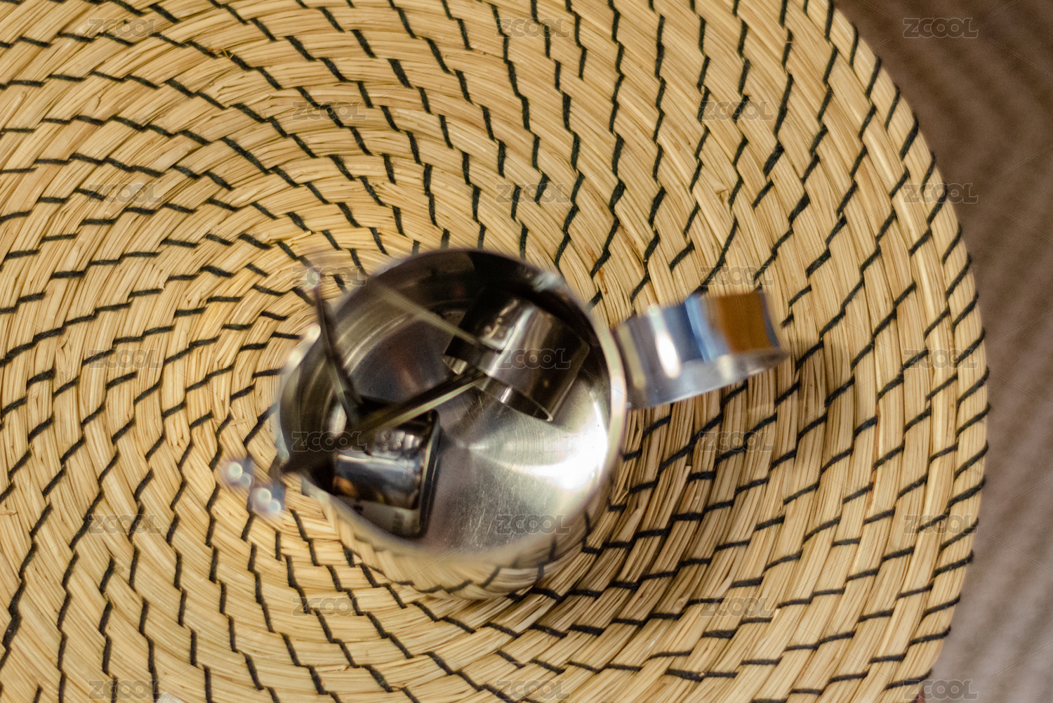 柳條編制的杯墊上放著一個不銹鋼杯子