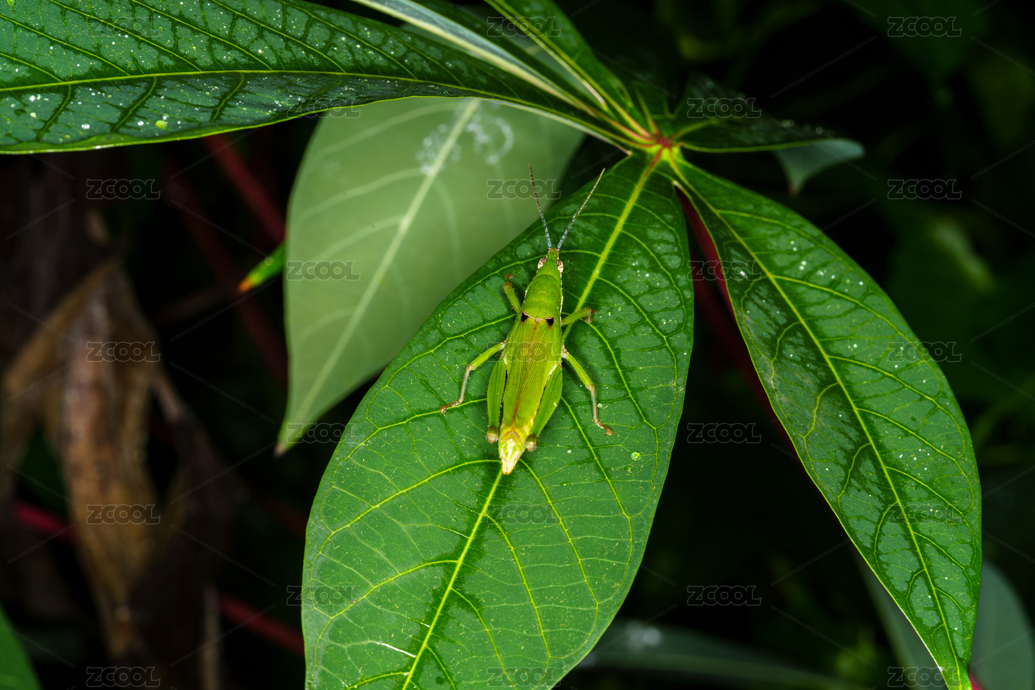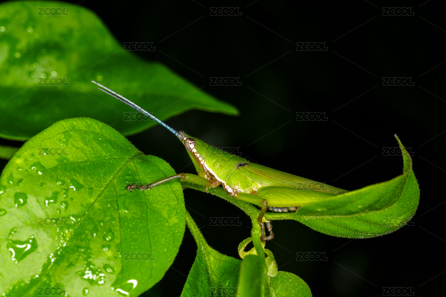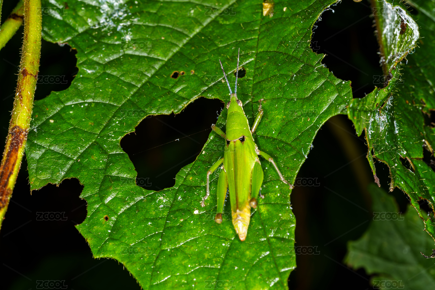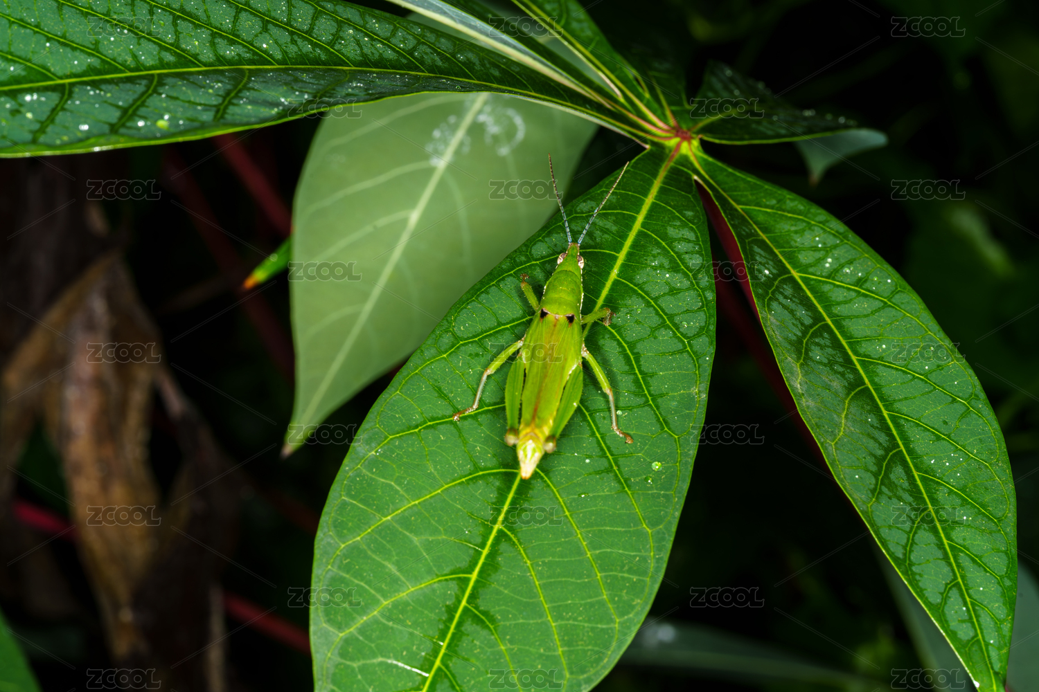 綠葉上的綠色小蚱蜢