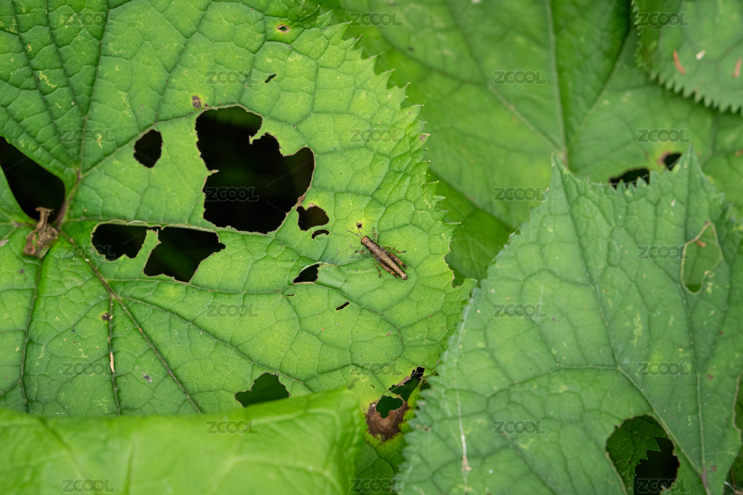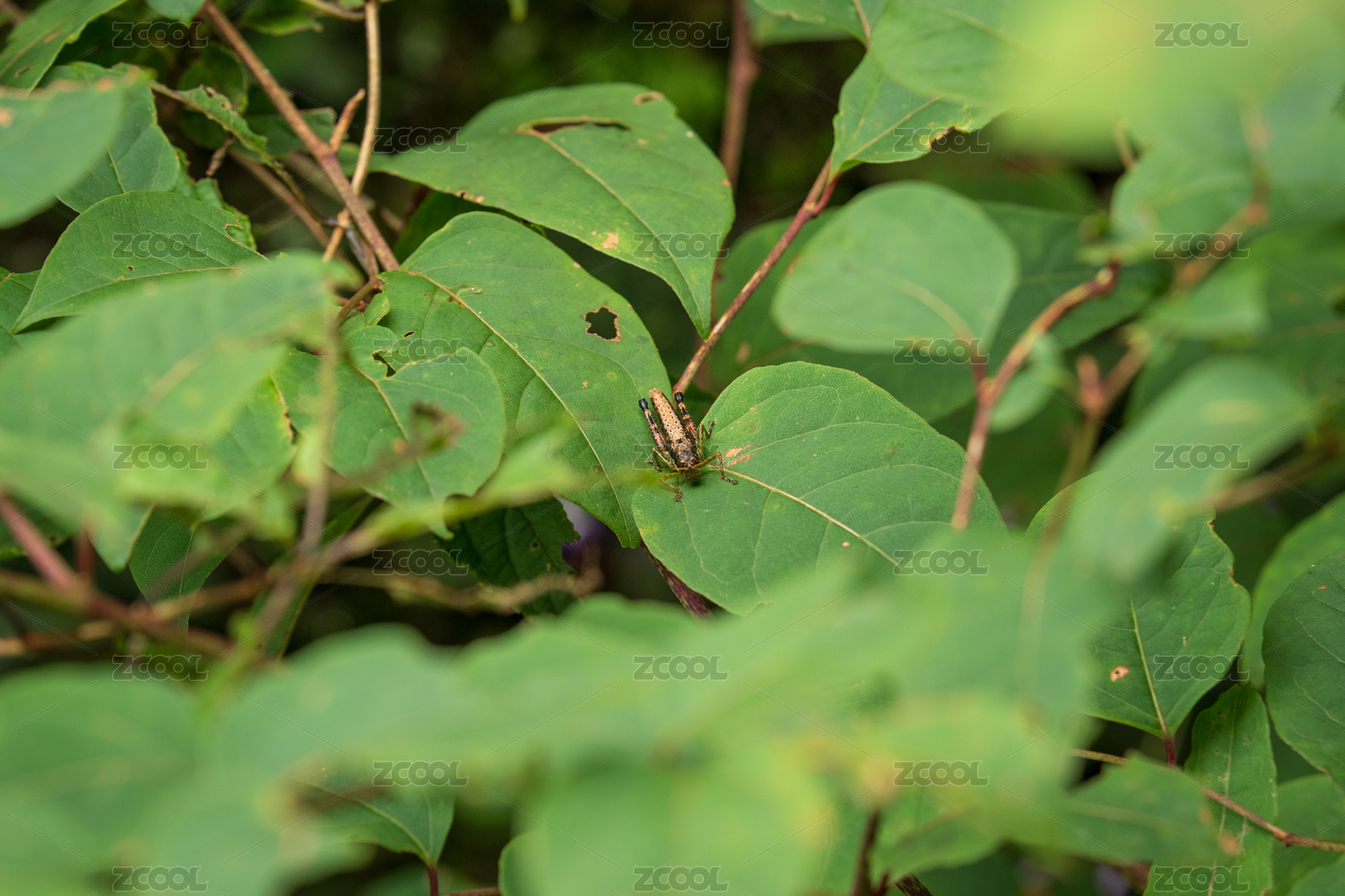 夏季清晨爬在樹葉上的蚱蜢