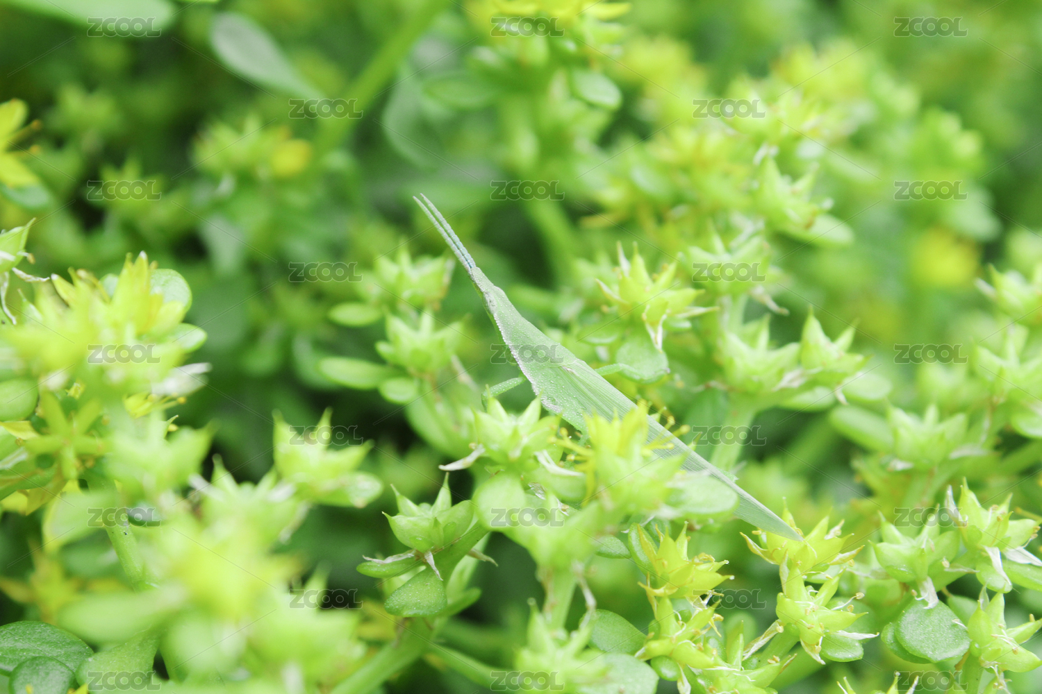 停在一片綠色的東南景天上的蚱蜢