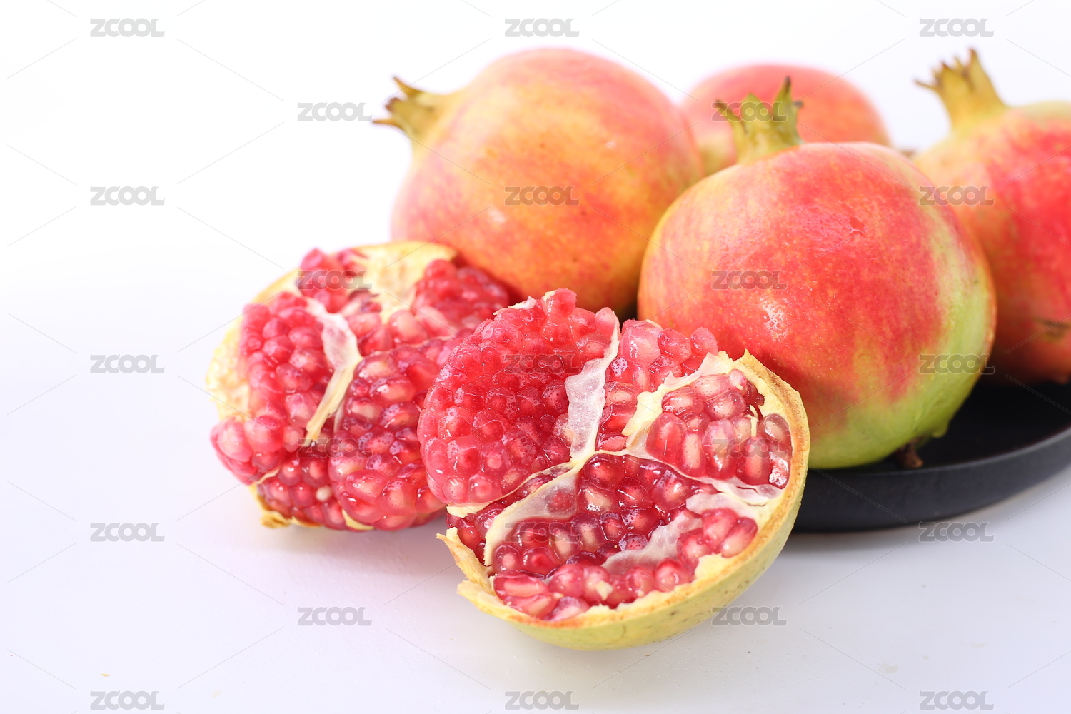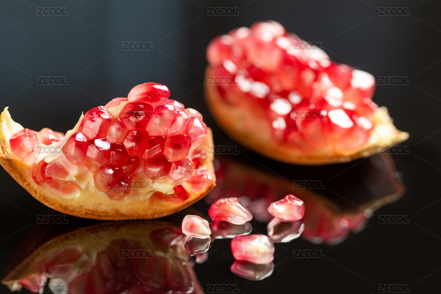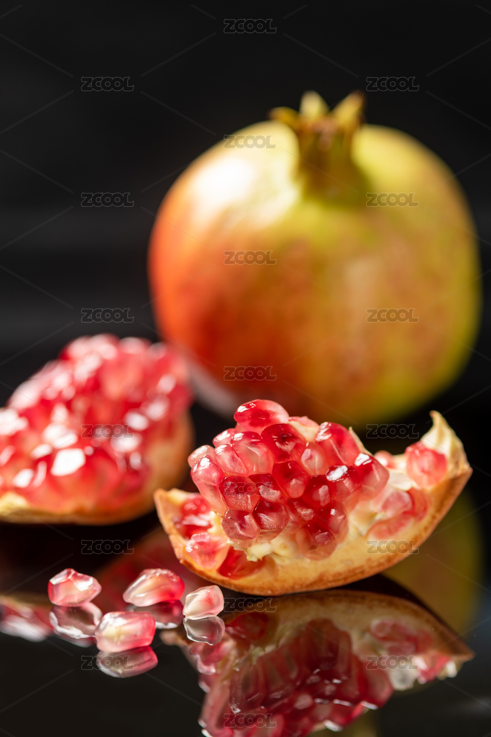 石榴和石榴籽擺放在黑色背景上