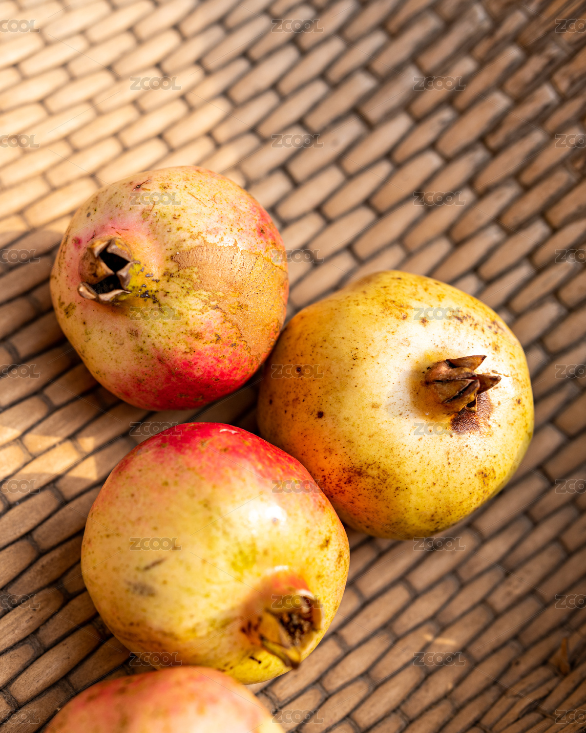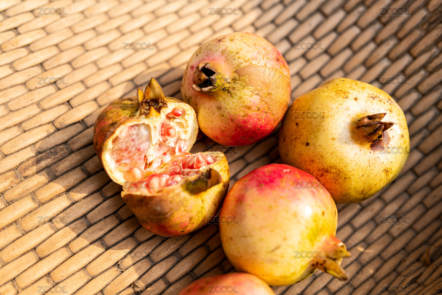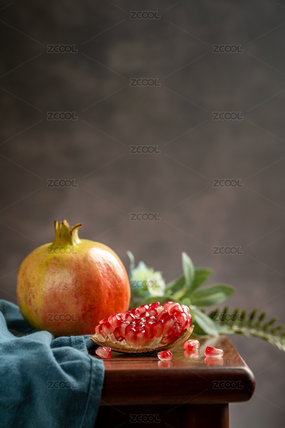 石榴和石榴籽擺放在中式桌面上