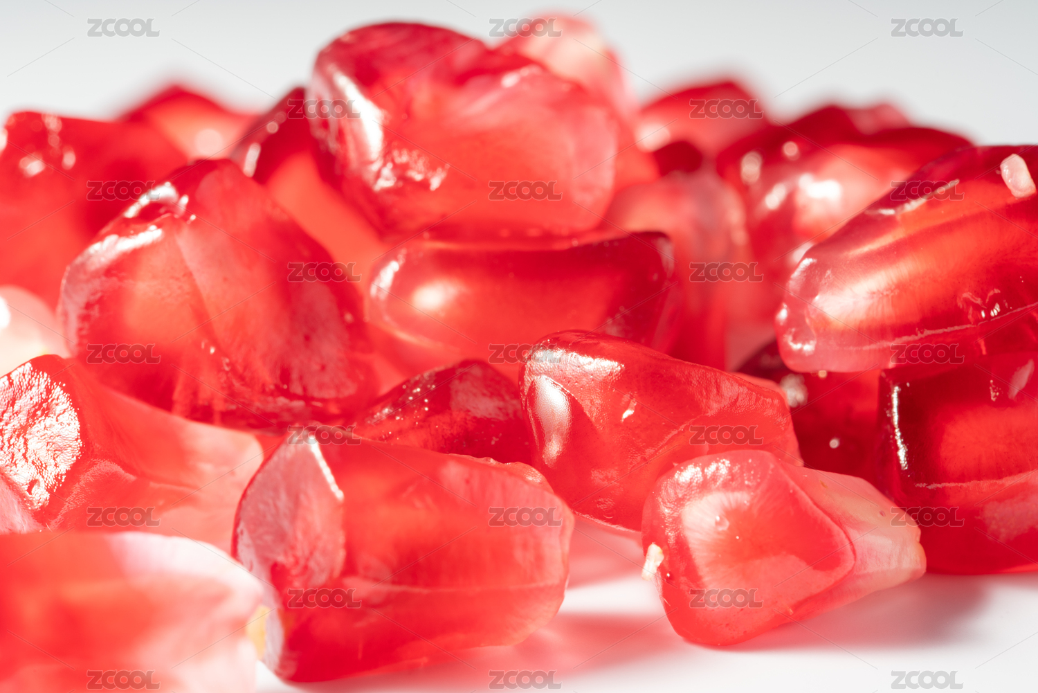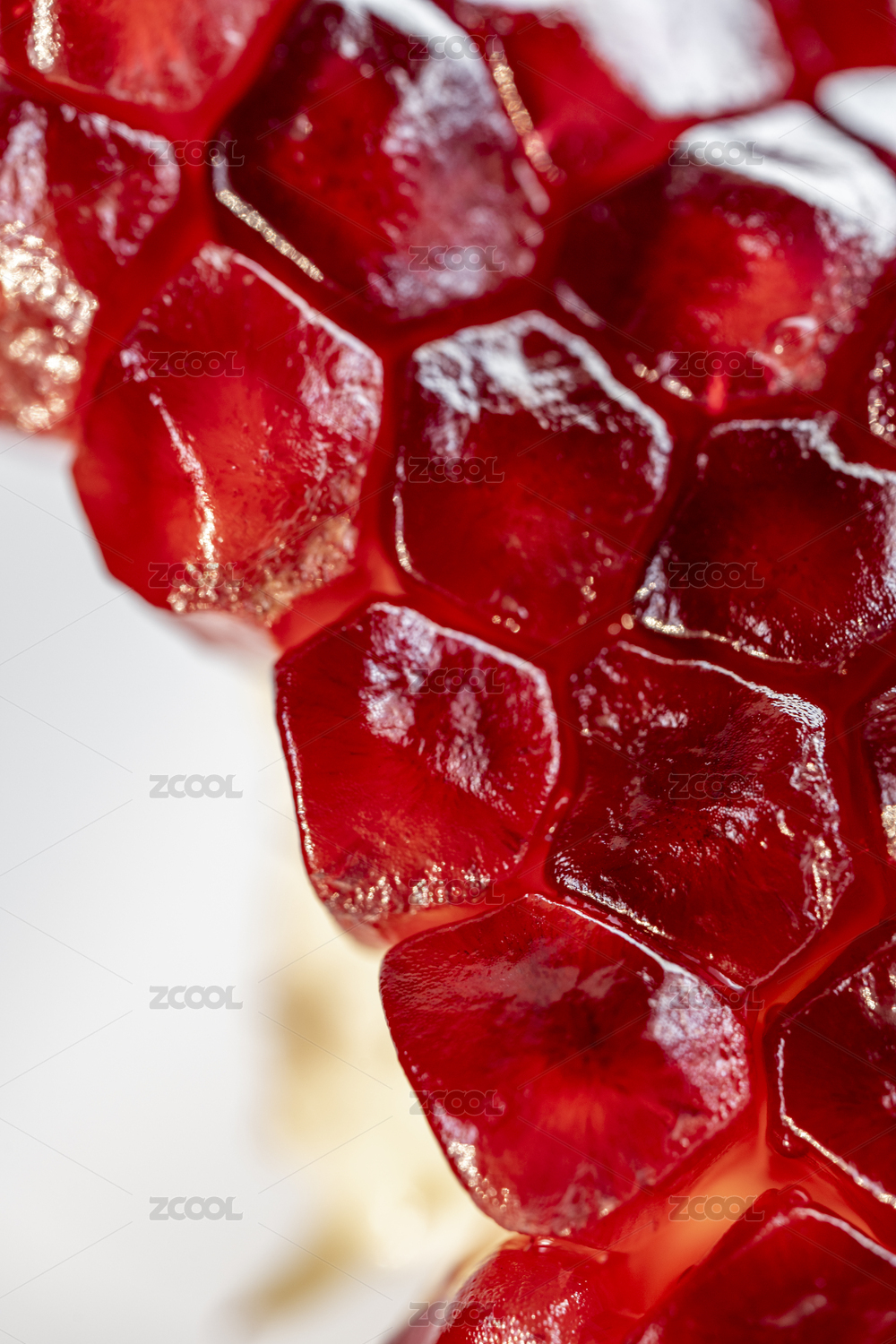 白色背景上剝開的石榴籽特寫