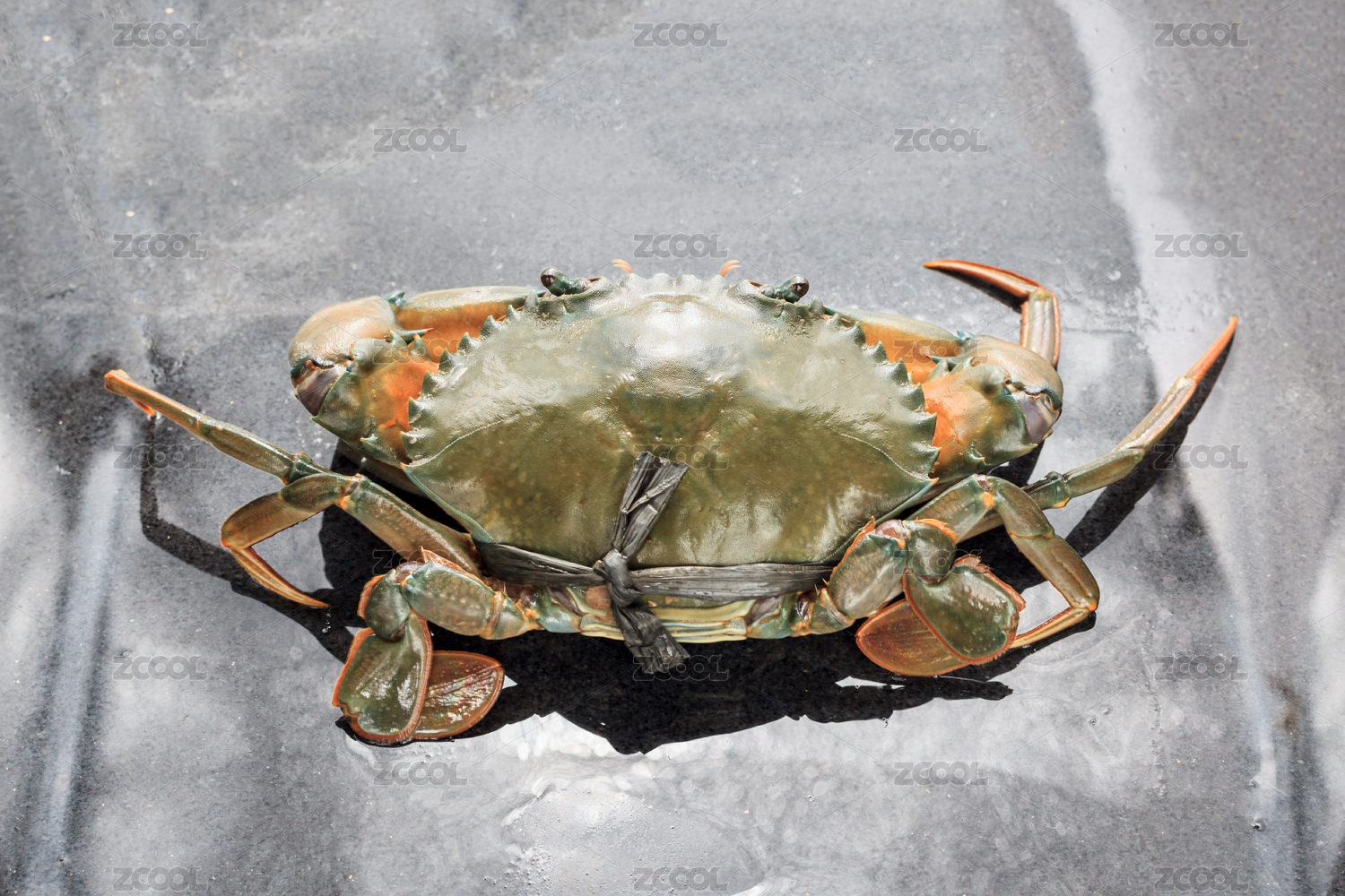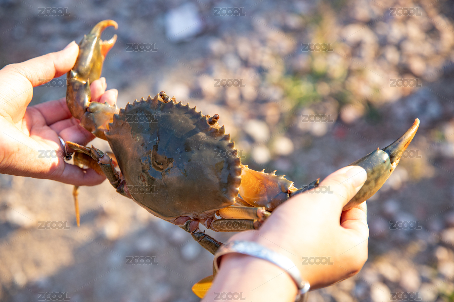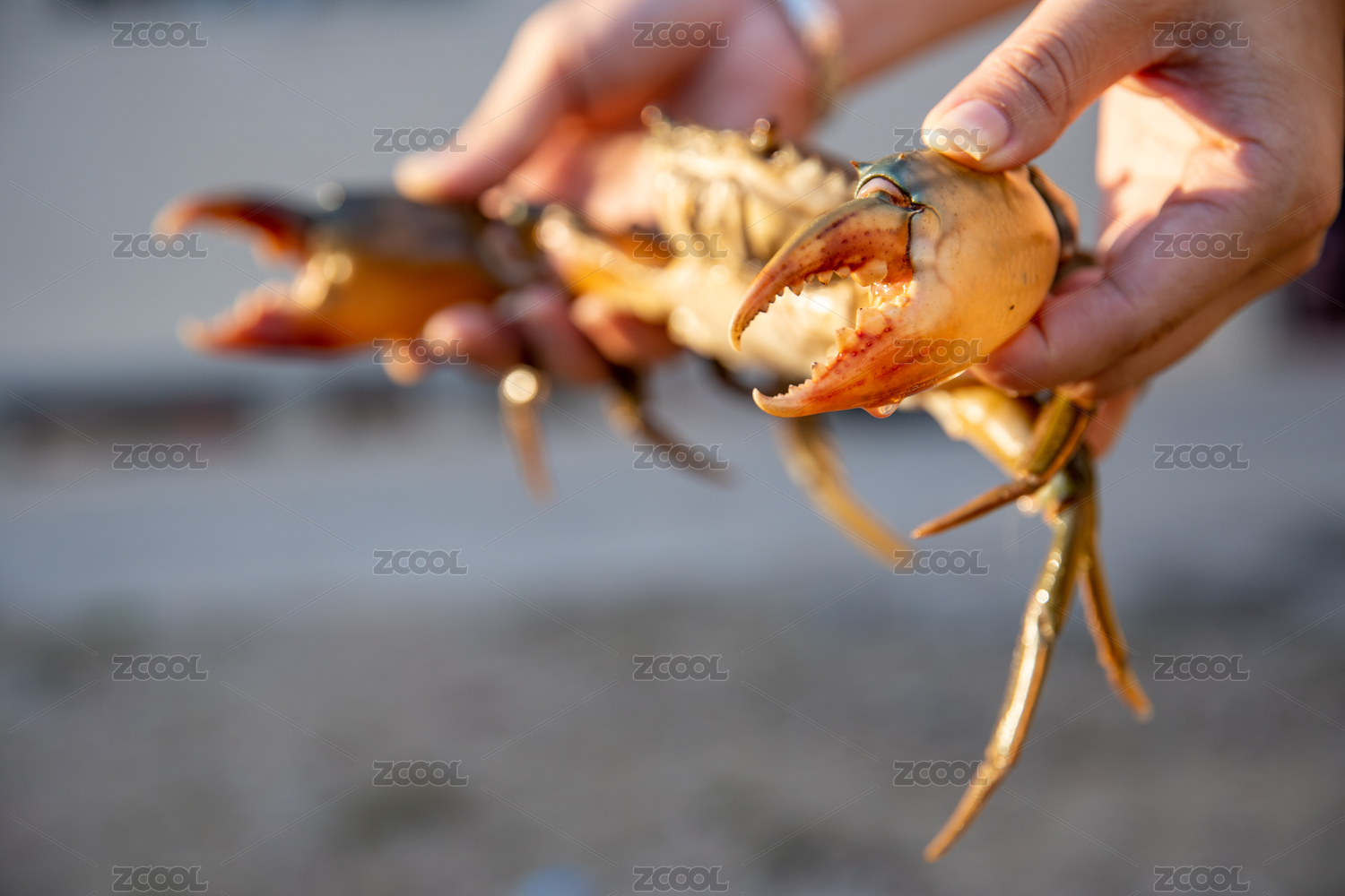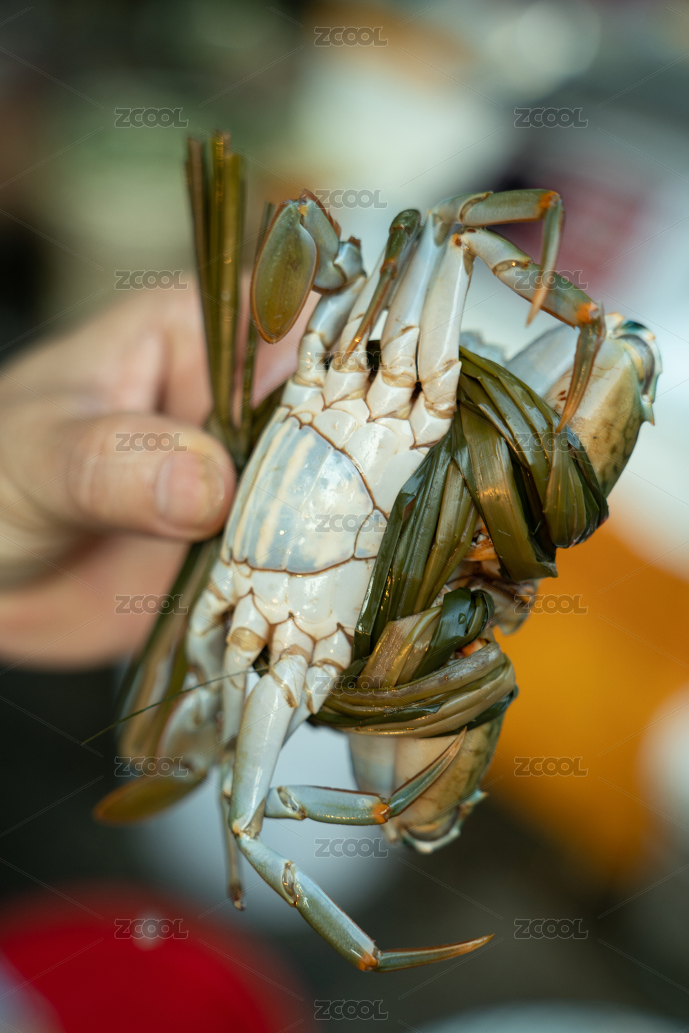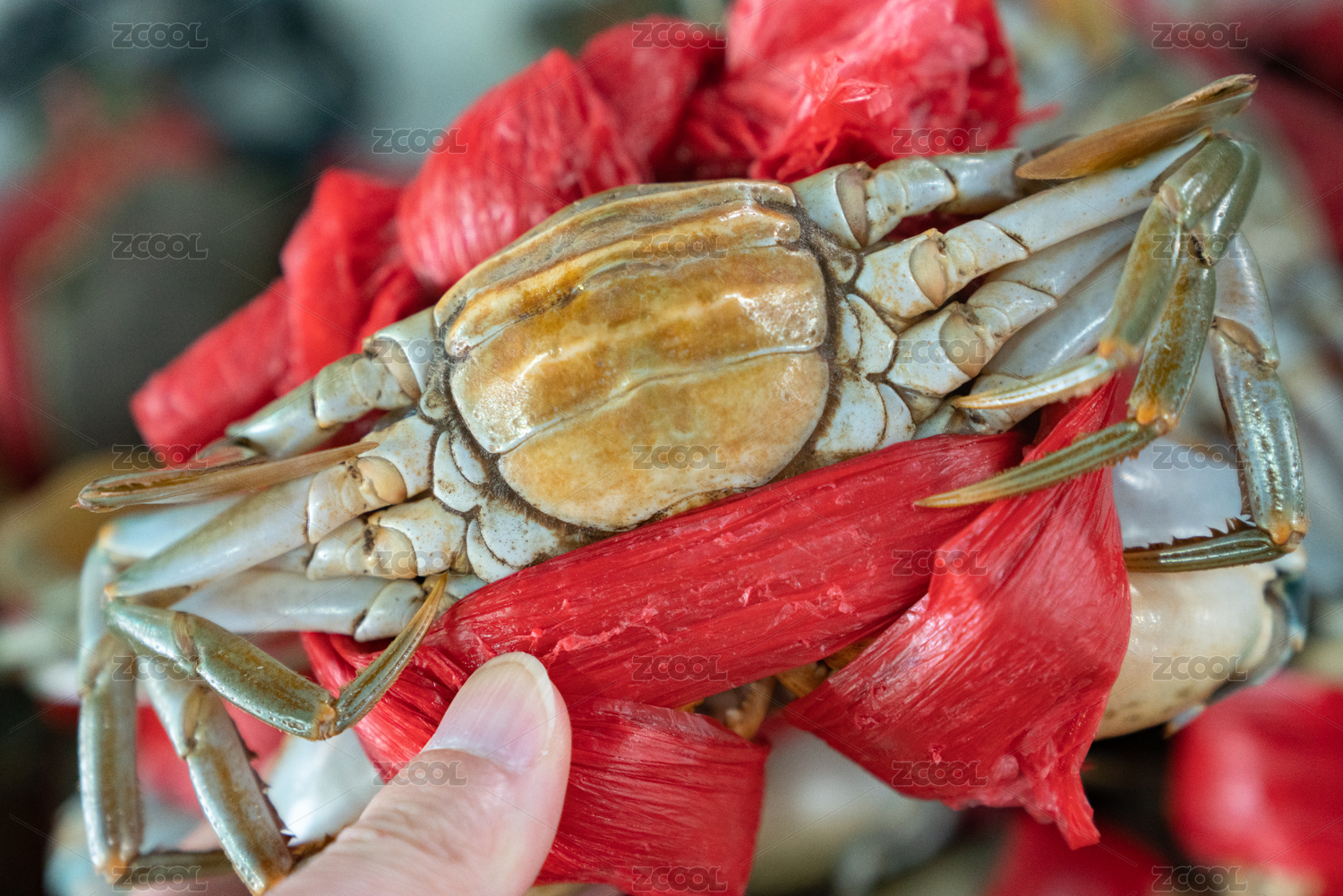 手拿著一只捆綁的大青蟹蟹臍特寫