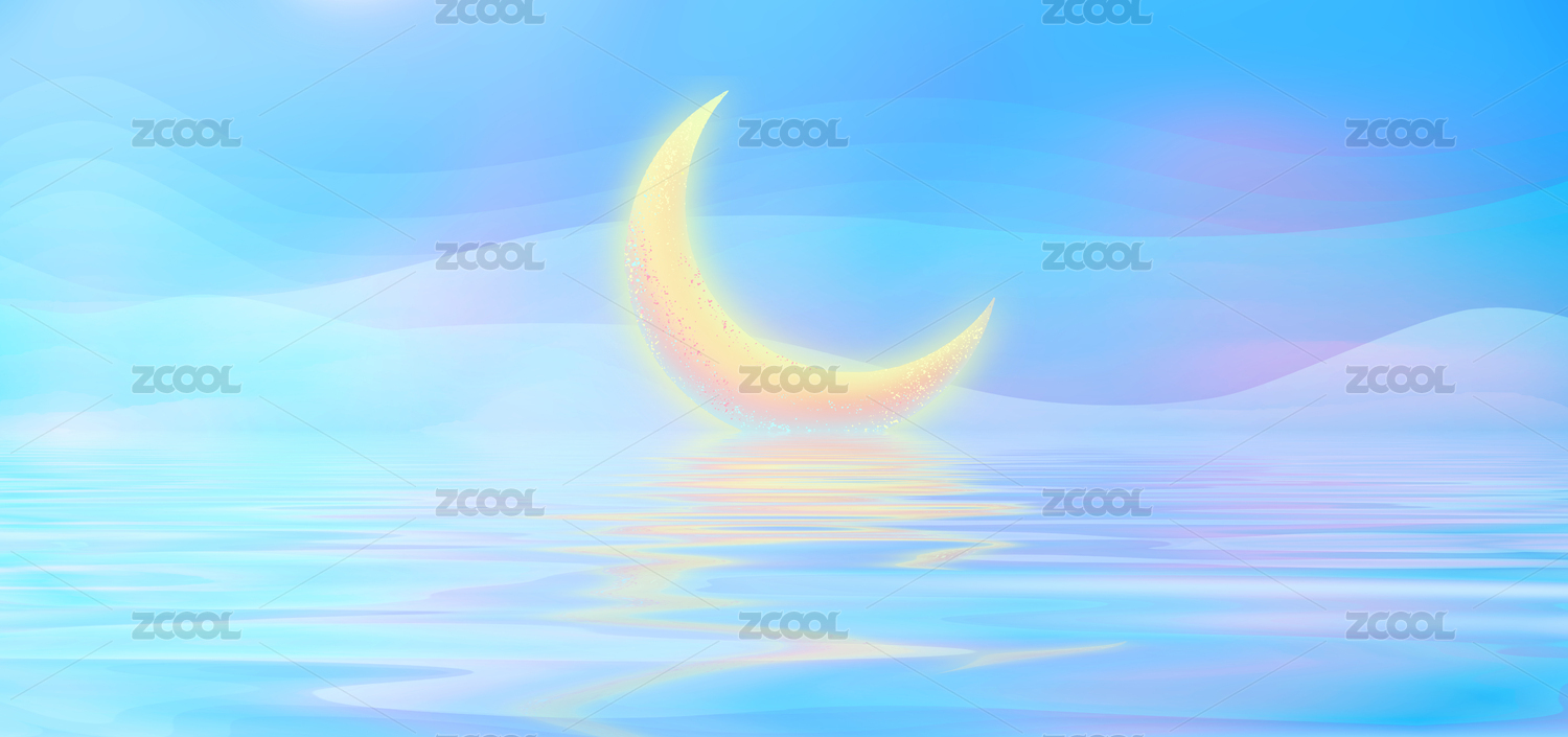 一輪通電后發(fā)光的月亮倒映在江面上,背面的電纜光纖起伏流動超現(xiàn)實插畫背景