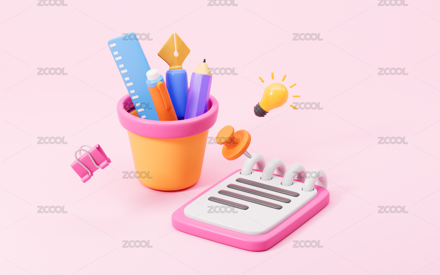 卡通筆筒和學(xué)習(xí)用品3D渲染