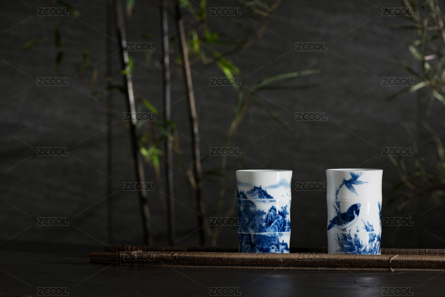 兩個精致青花陶瓷筆筒在桌面上,在暗調(diào)背景中