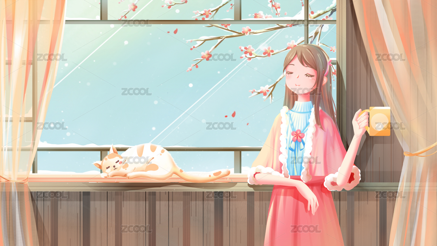 美女拿著杯飲品愜意的站在窗邊貓趴窗臺睡覺