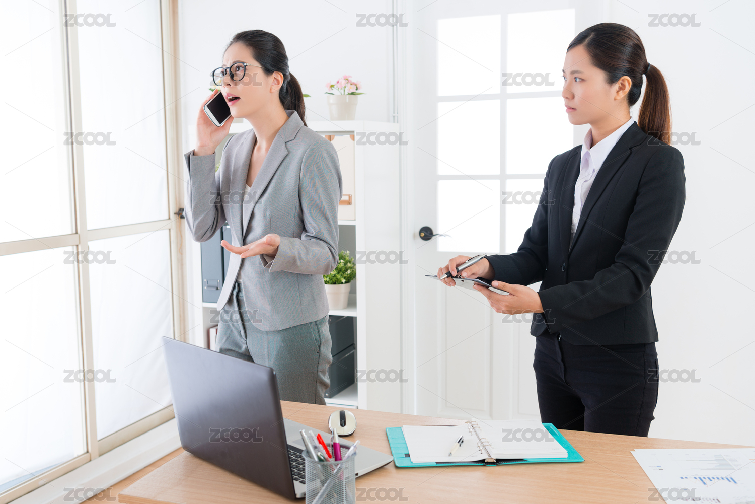 優(yōu)雅迷人的女助手業(yè)務(wù)持提案文件等時使用移動智能手機(jī)上司與客戶交談的報(bào)告。
