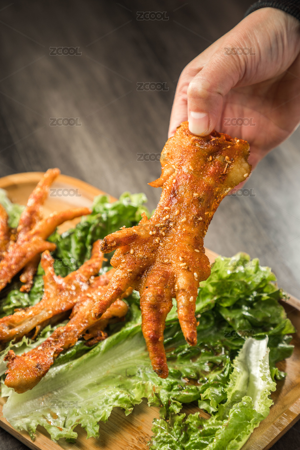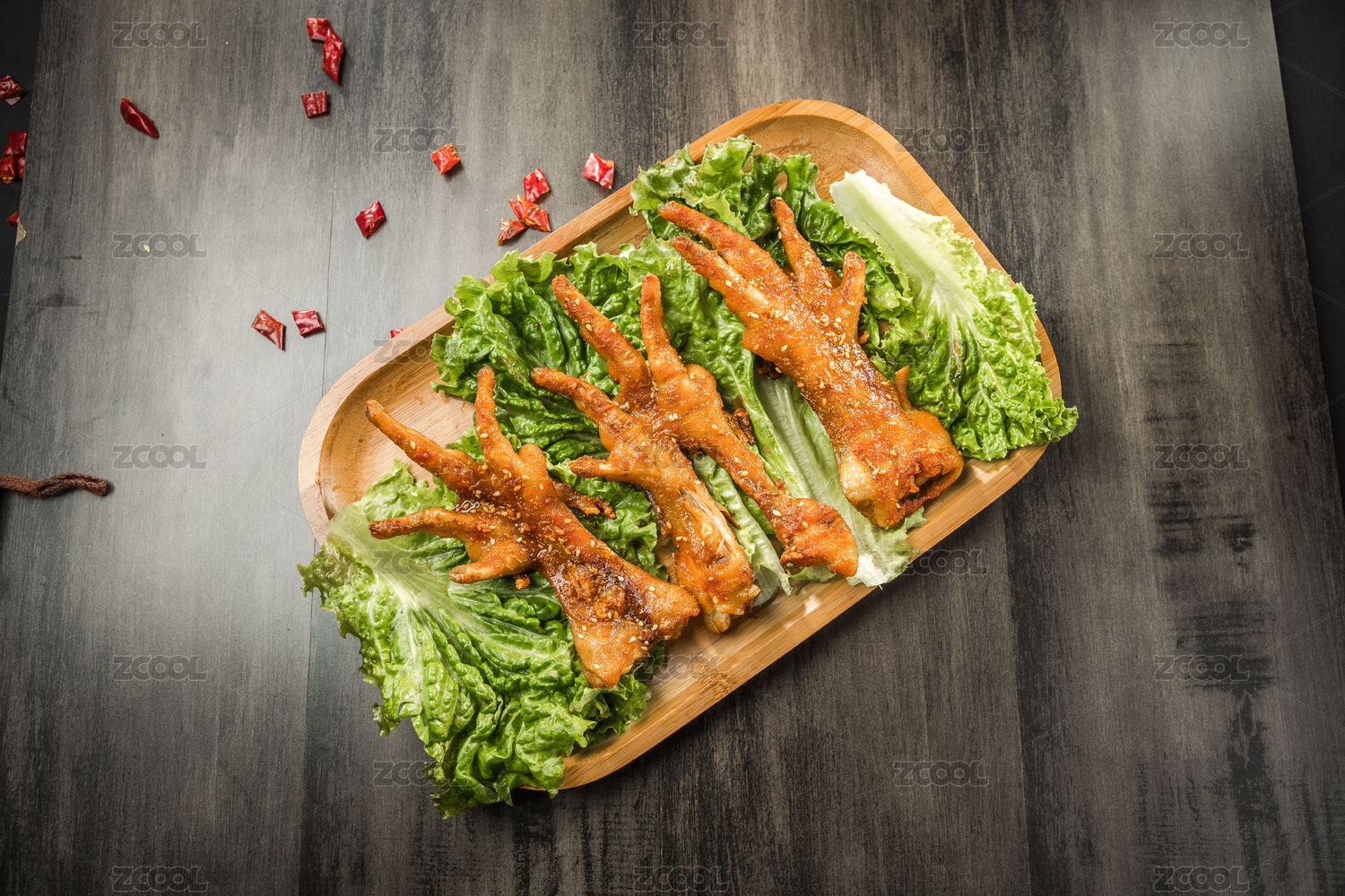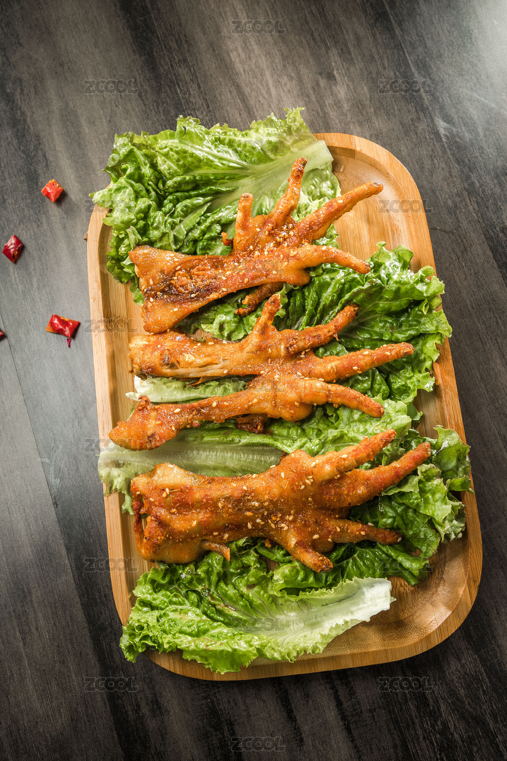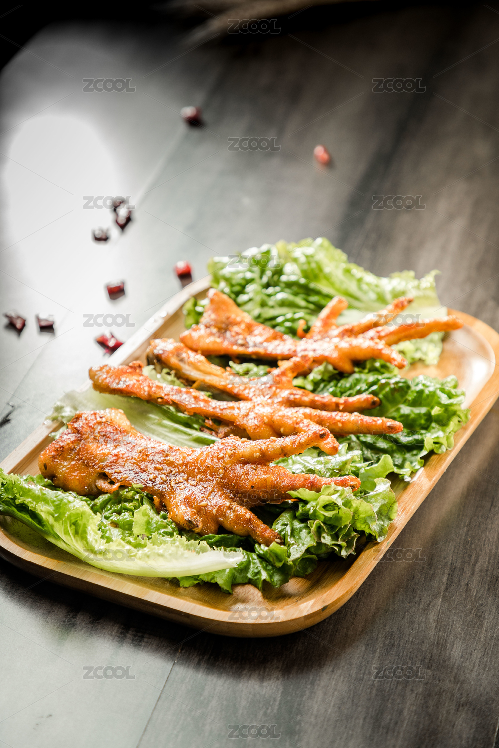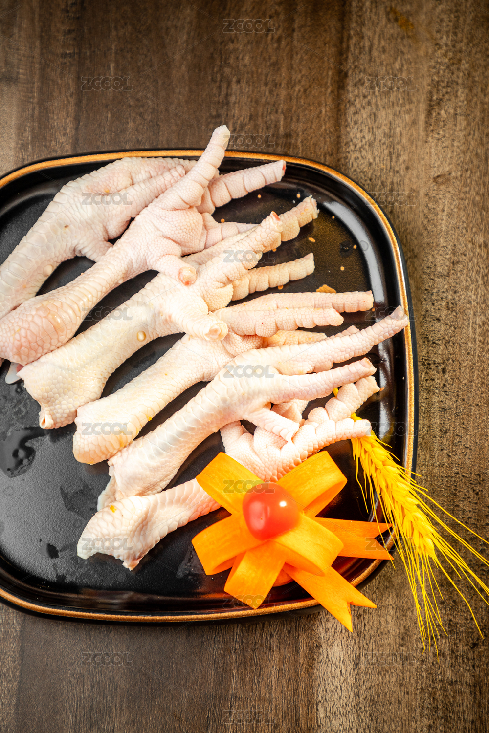 暗色木紋桌上放著一盤(pán)烤雞爪子