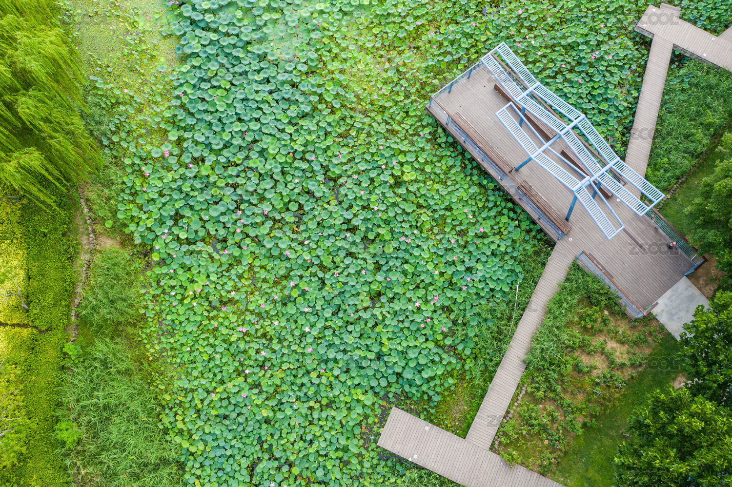 航拍鄭州北龍湖濕地公園荷塘風光碧綠荷葉