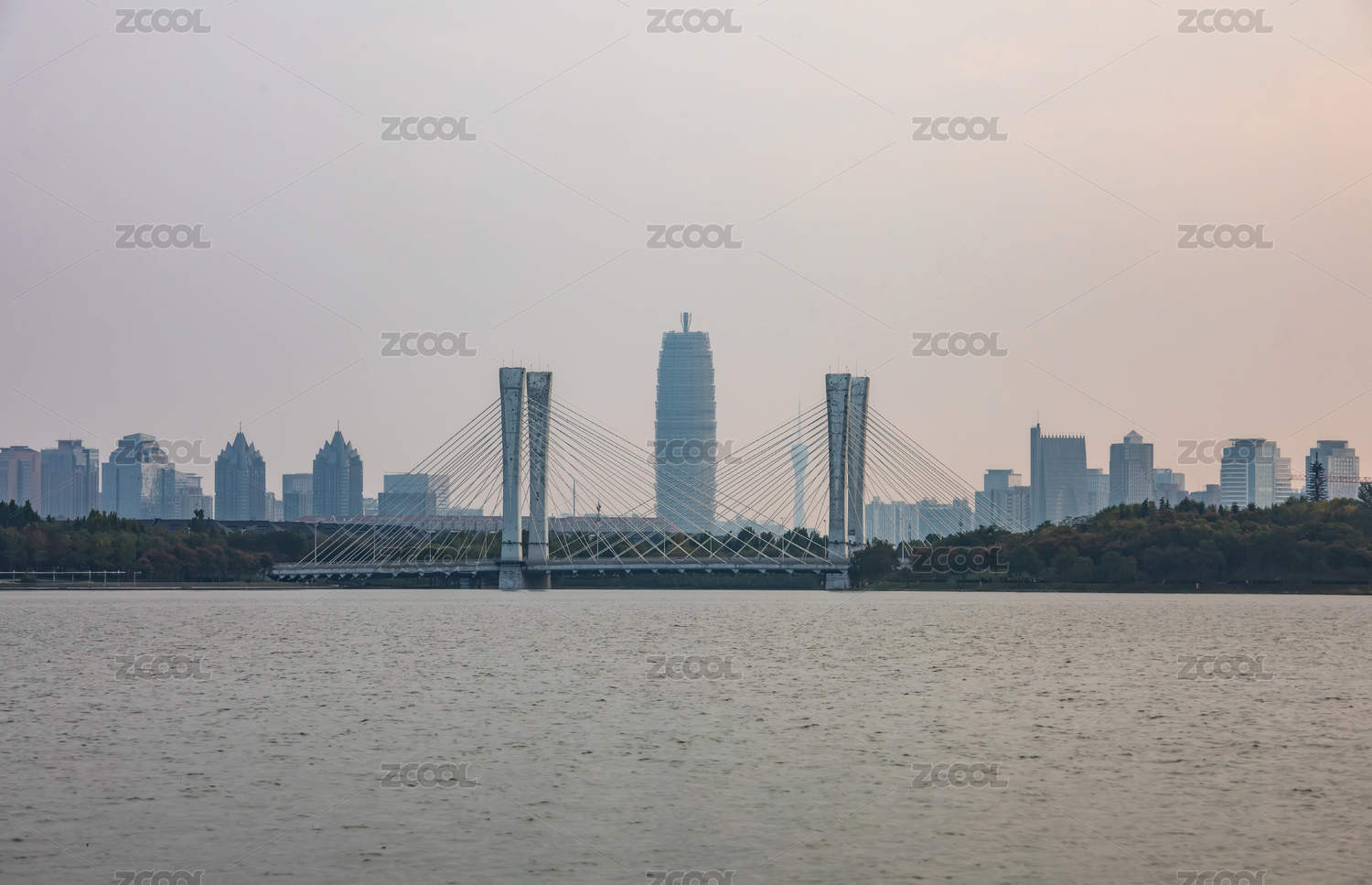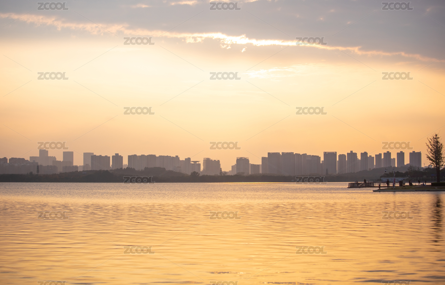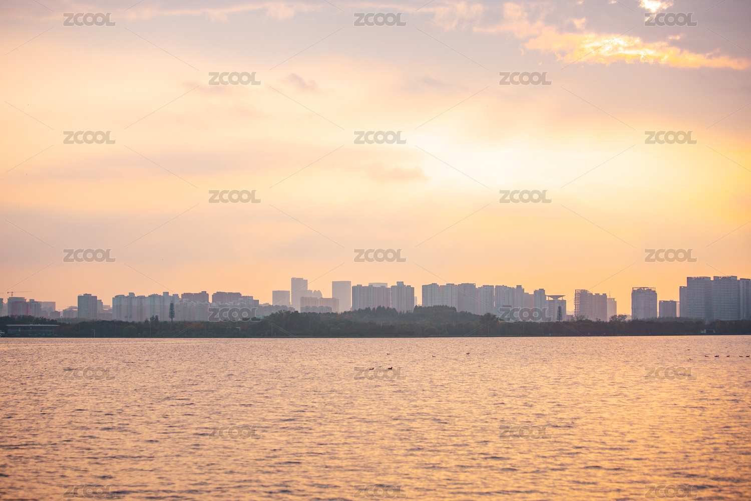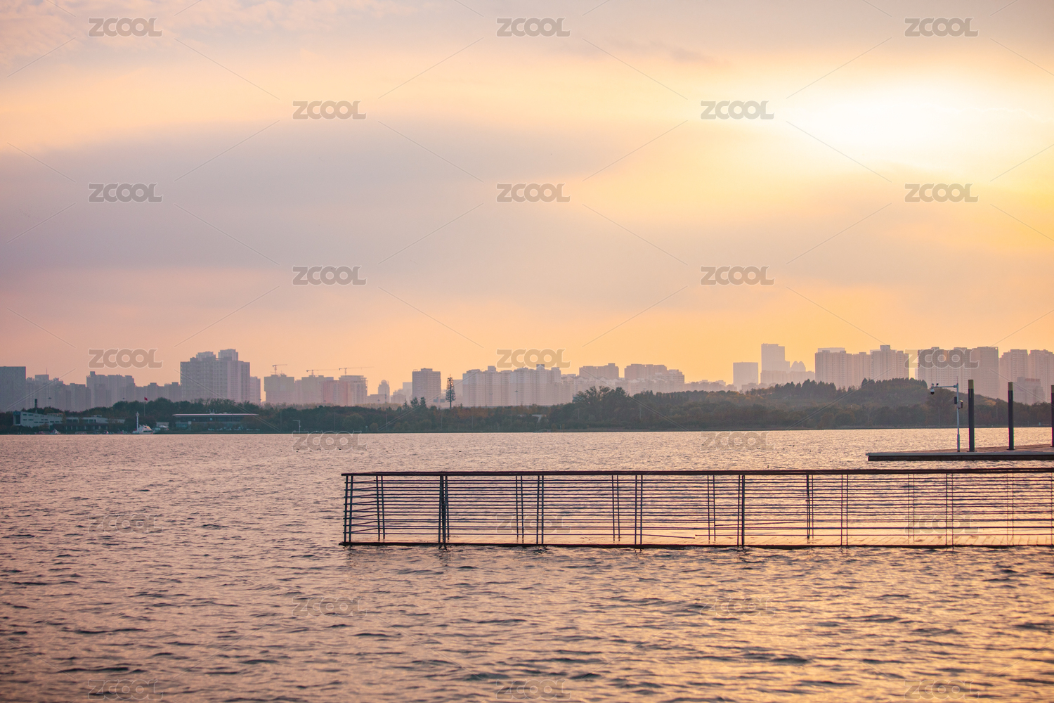 河南鄭州北龍湖濕地公園湖岸日落風景