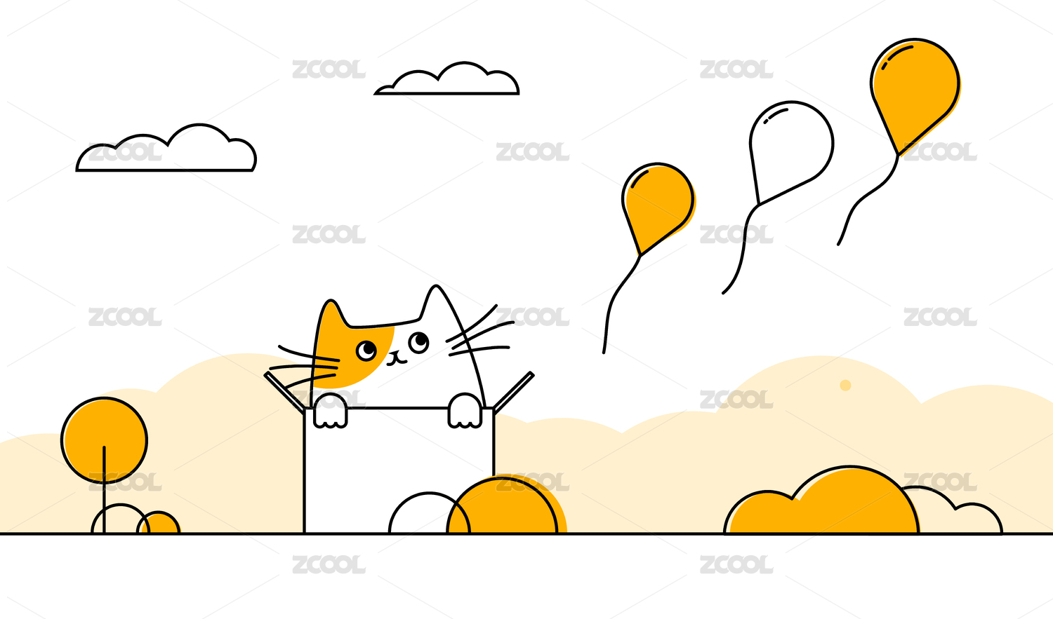 盒子里的貓咪在看空中飄動(dòng)的汽球線條風(fēng)格矢