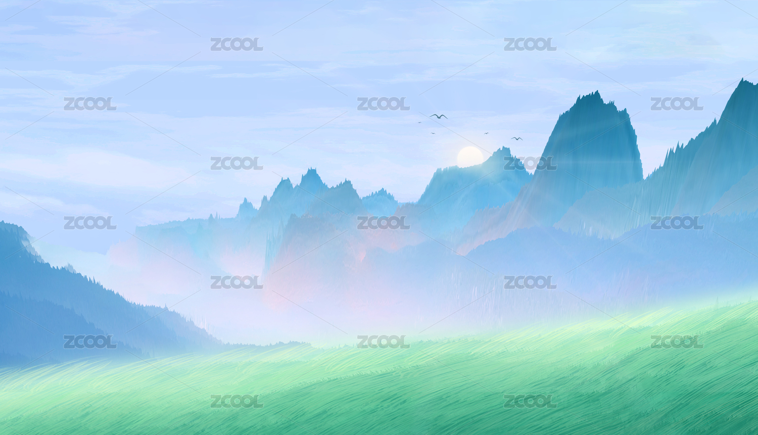 早晨太陽從山的天邊升起,綠色的山坡上野草隨風(fēng)飄動(dòng)插畫背景