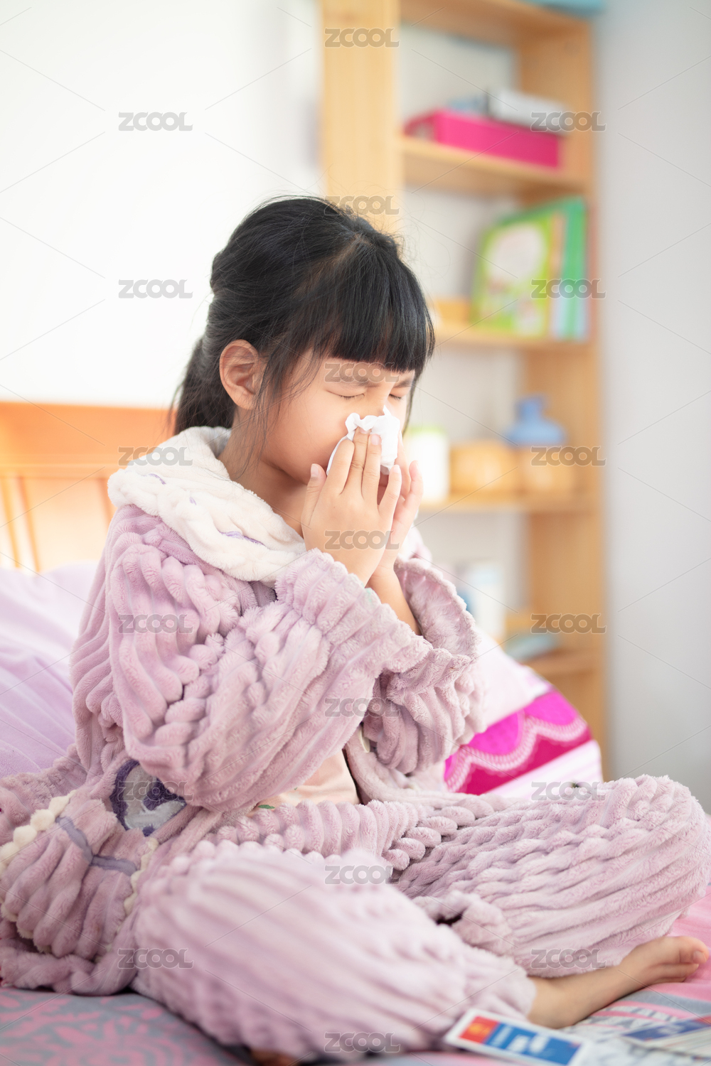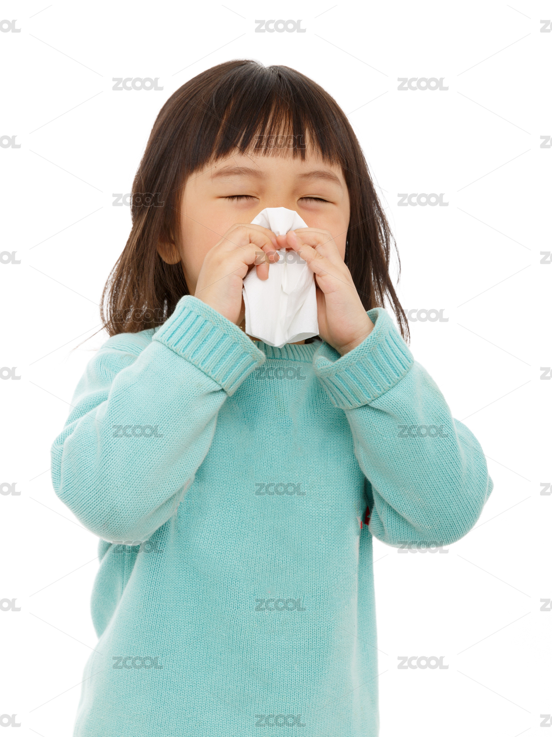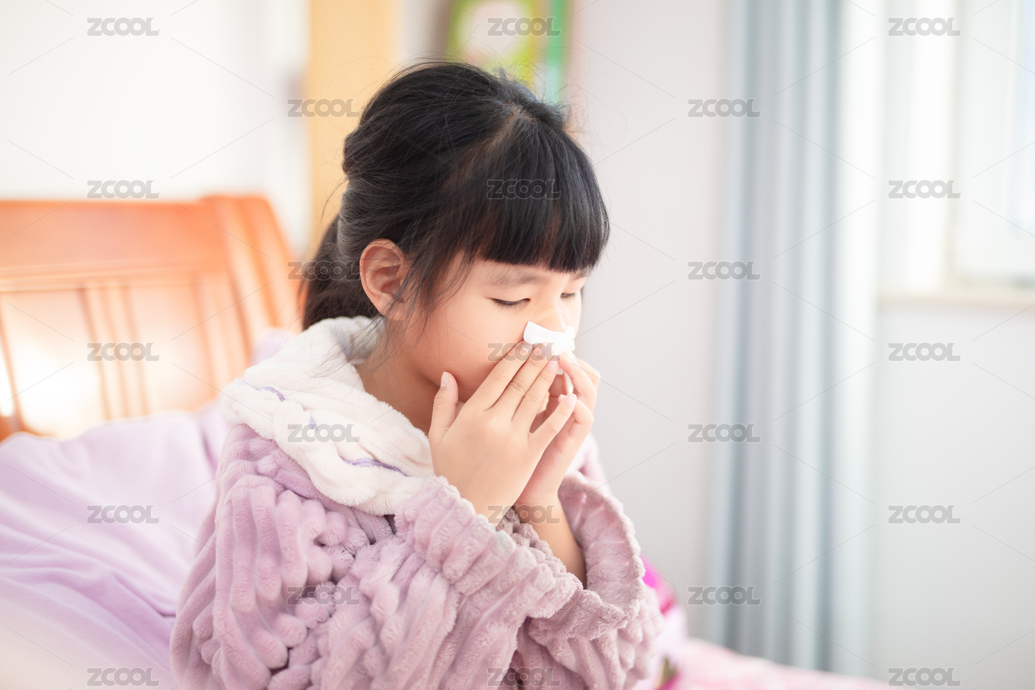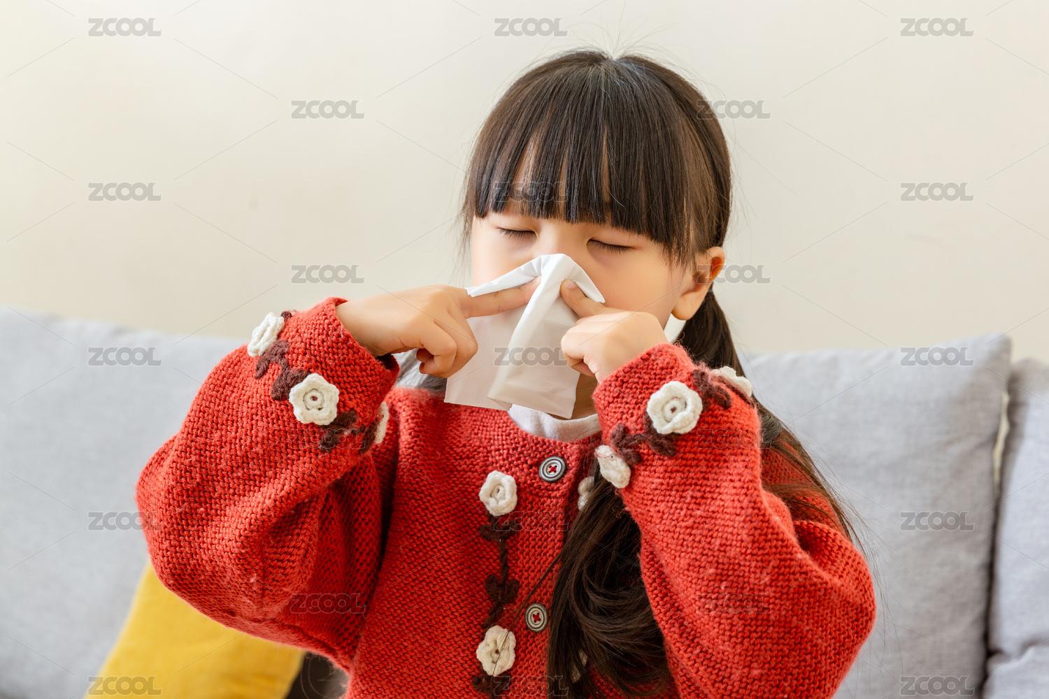 感冒流鼻涕用紙巾擦鼻子的小女孩