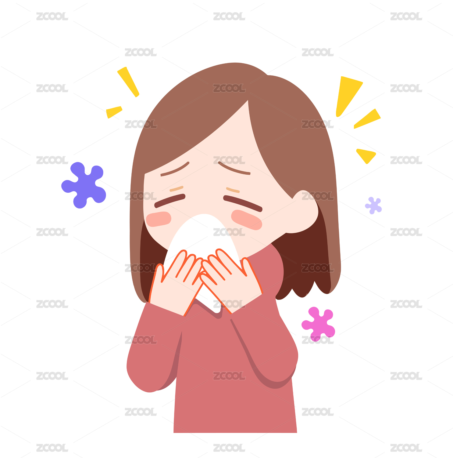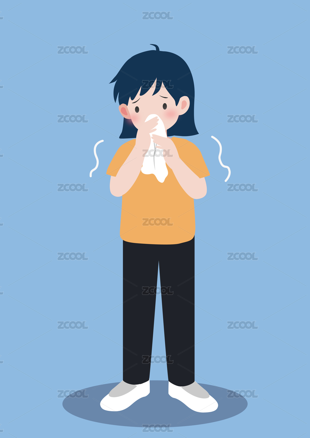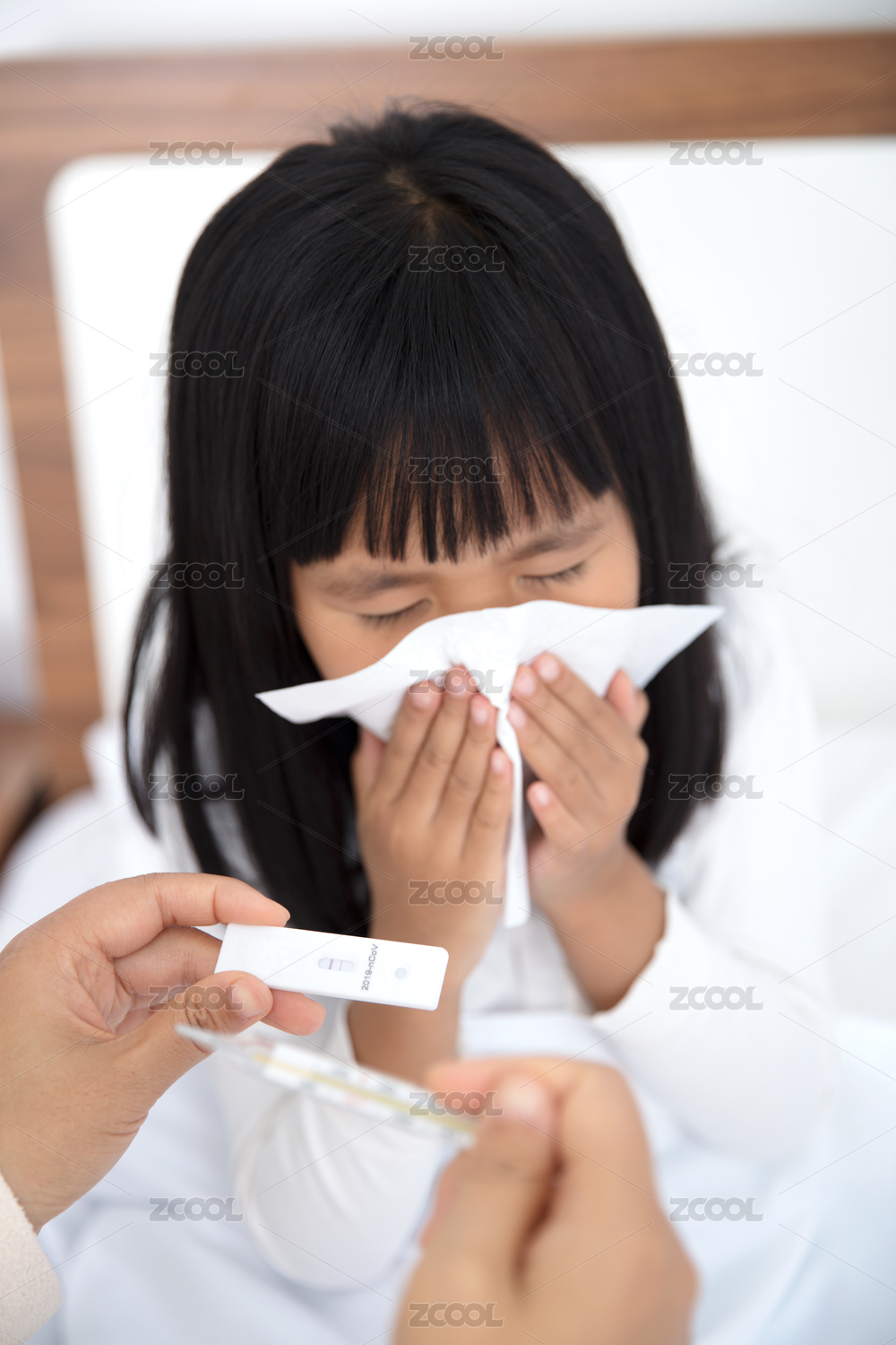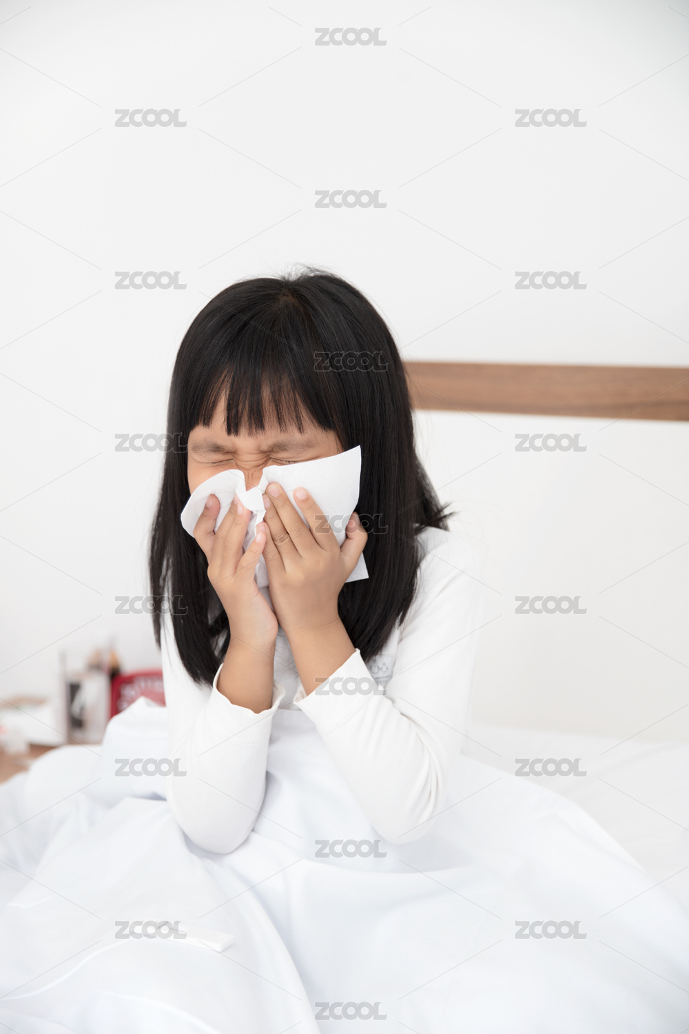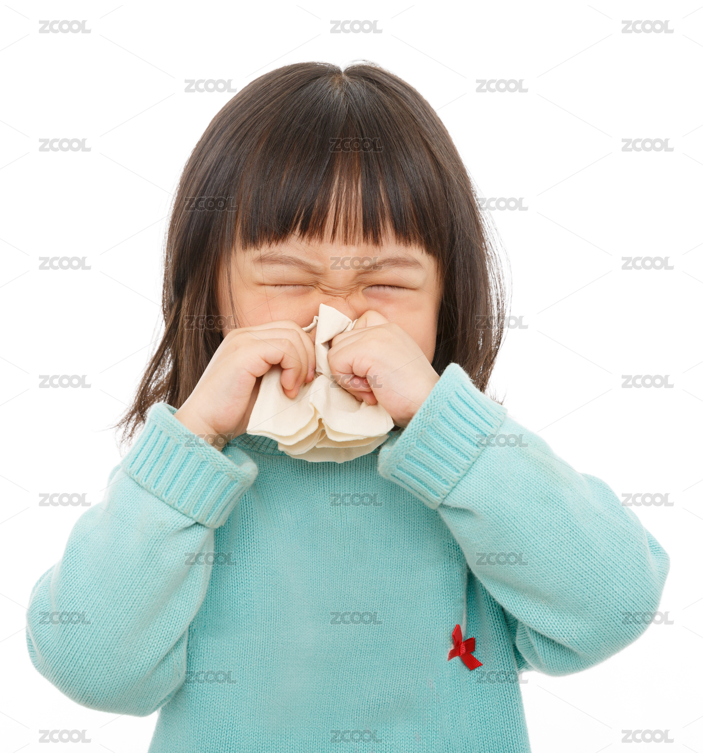 感冒流鼻涕用紙巾擦鼻子的小女孩