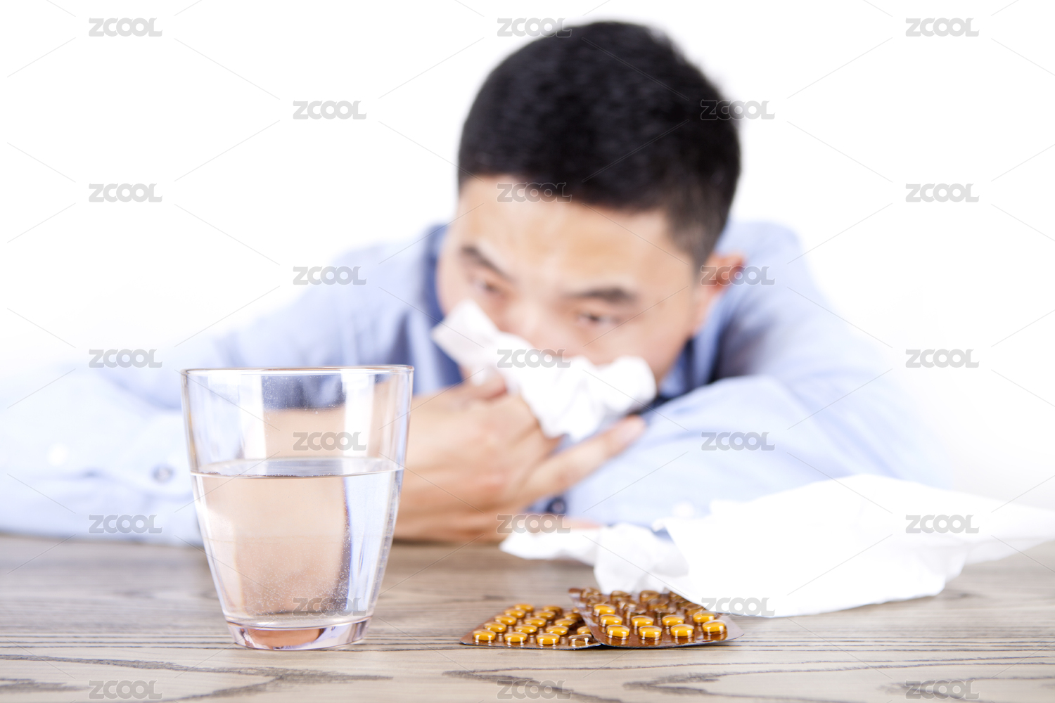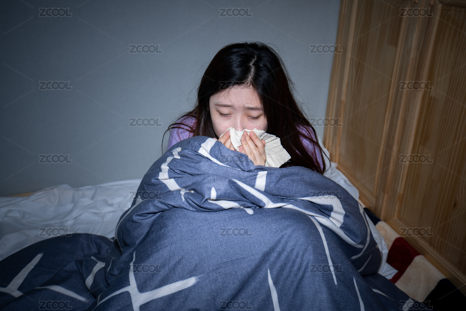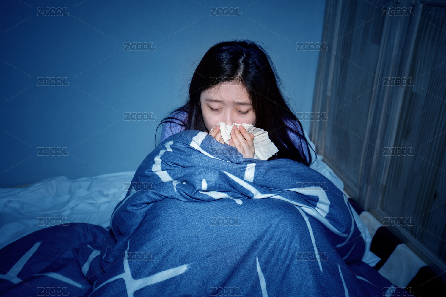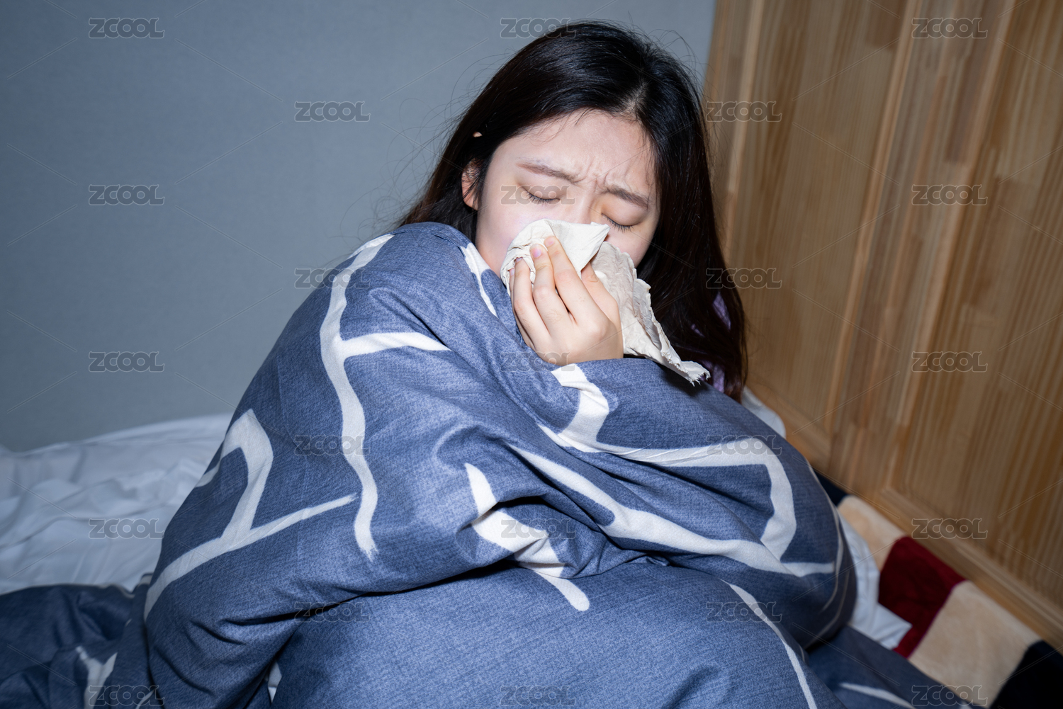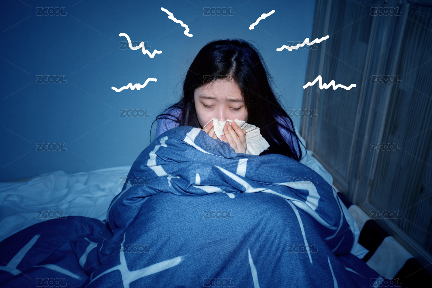 女病人因為著涼而感冒發(fā)燒擤鼻涕冷到縮成一團概念
