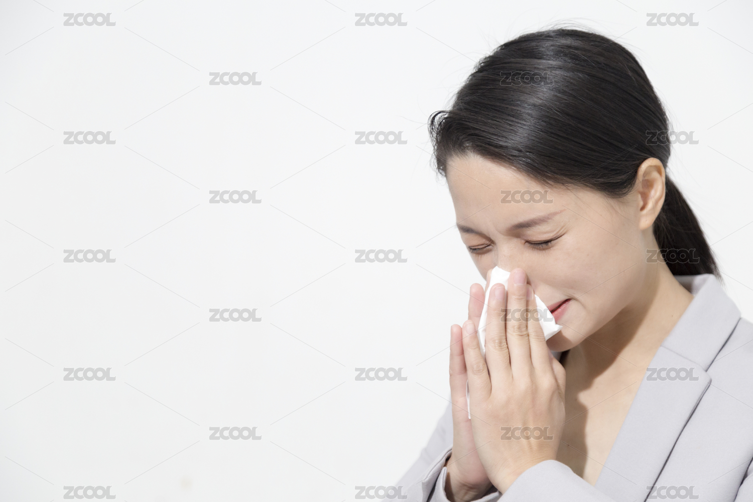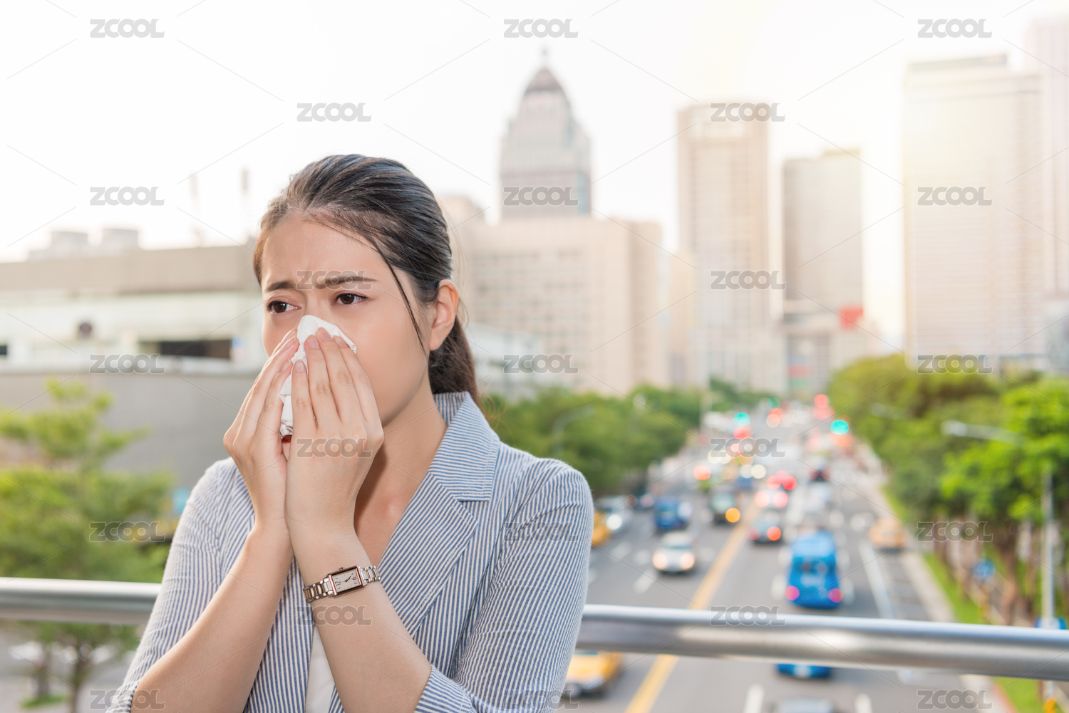 迷人的辦公室女郎得到了過敏和空氣污染流鼻涕和使用高峰時段,交通出行紙巾。