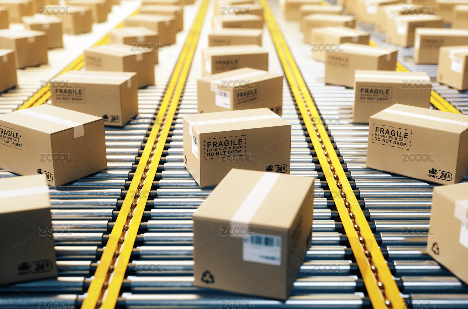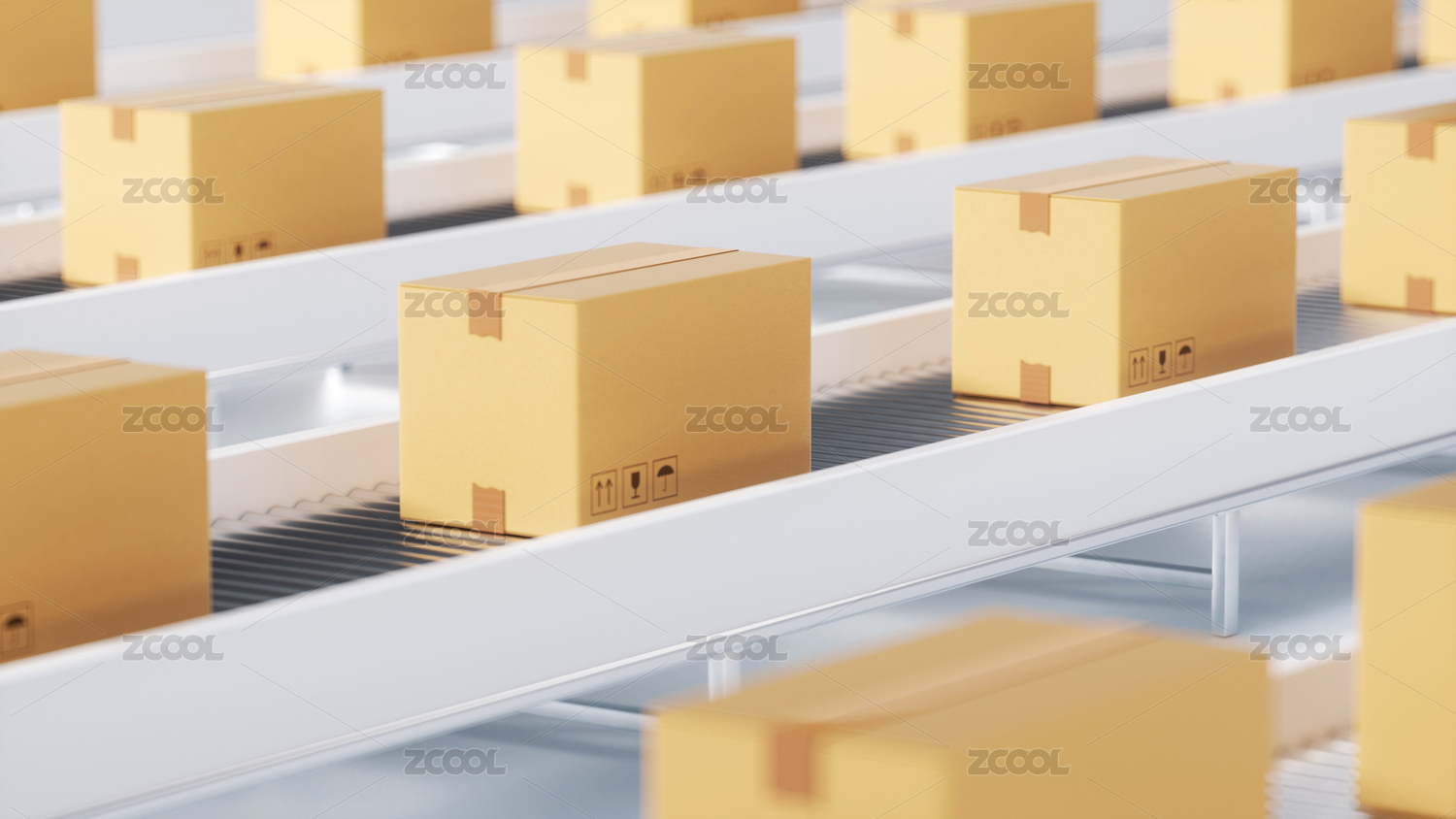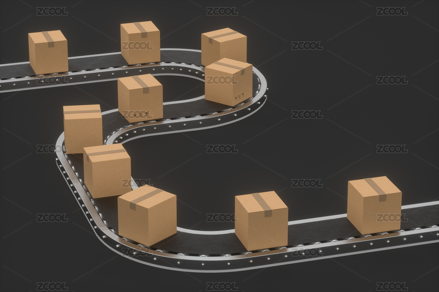 包裝紙箱與貨物傳送帶 三維渲染