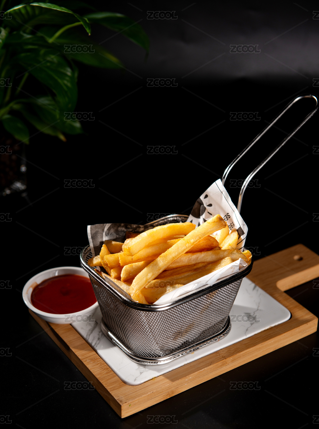 黑色背景不銹鋼漏勺里的煎炸薯?xiàng)l