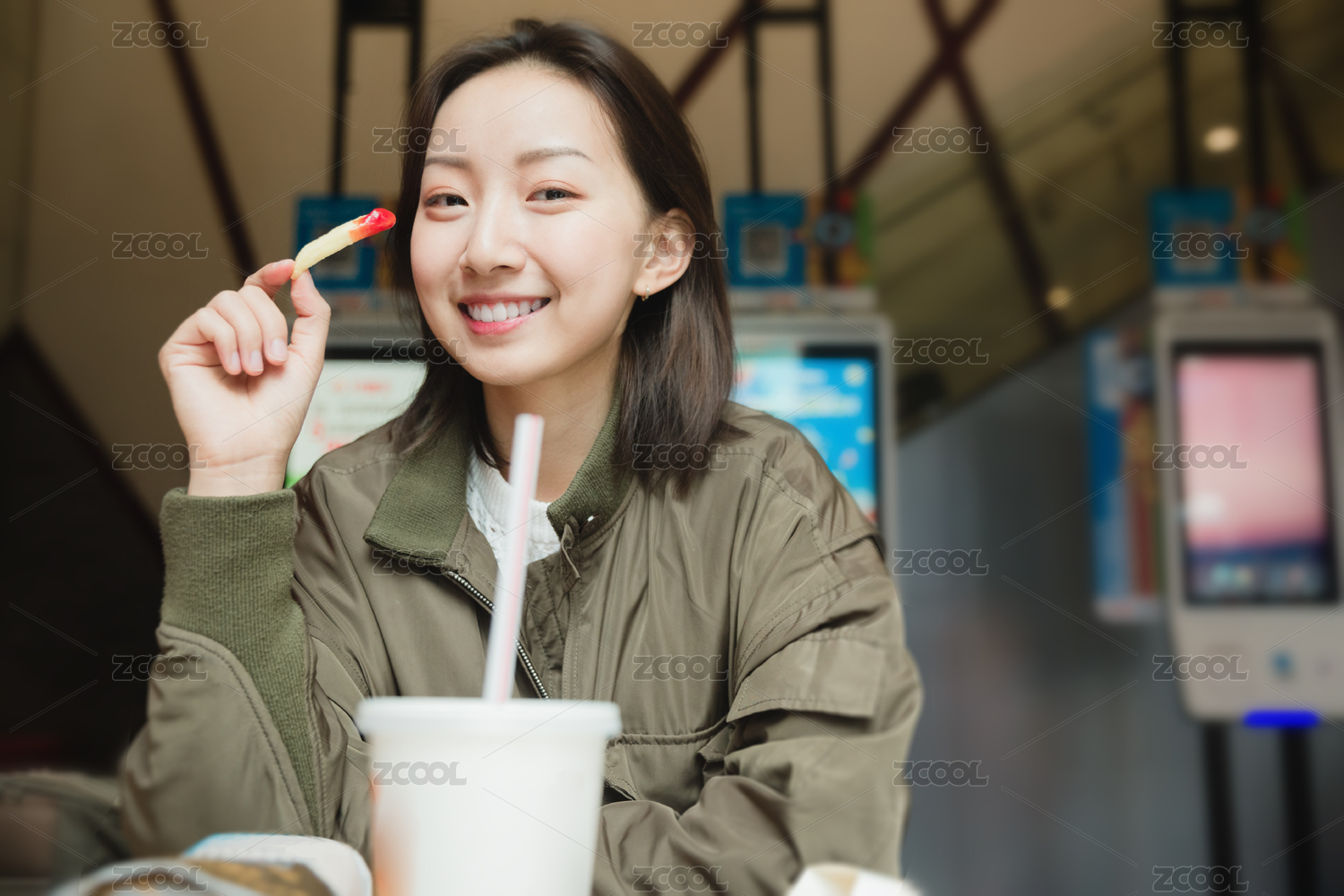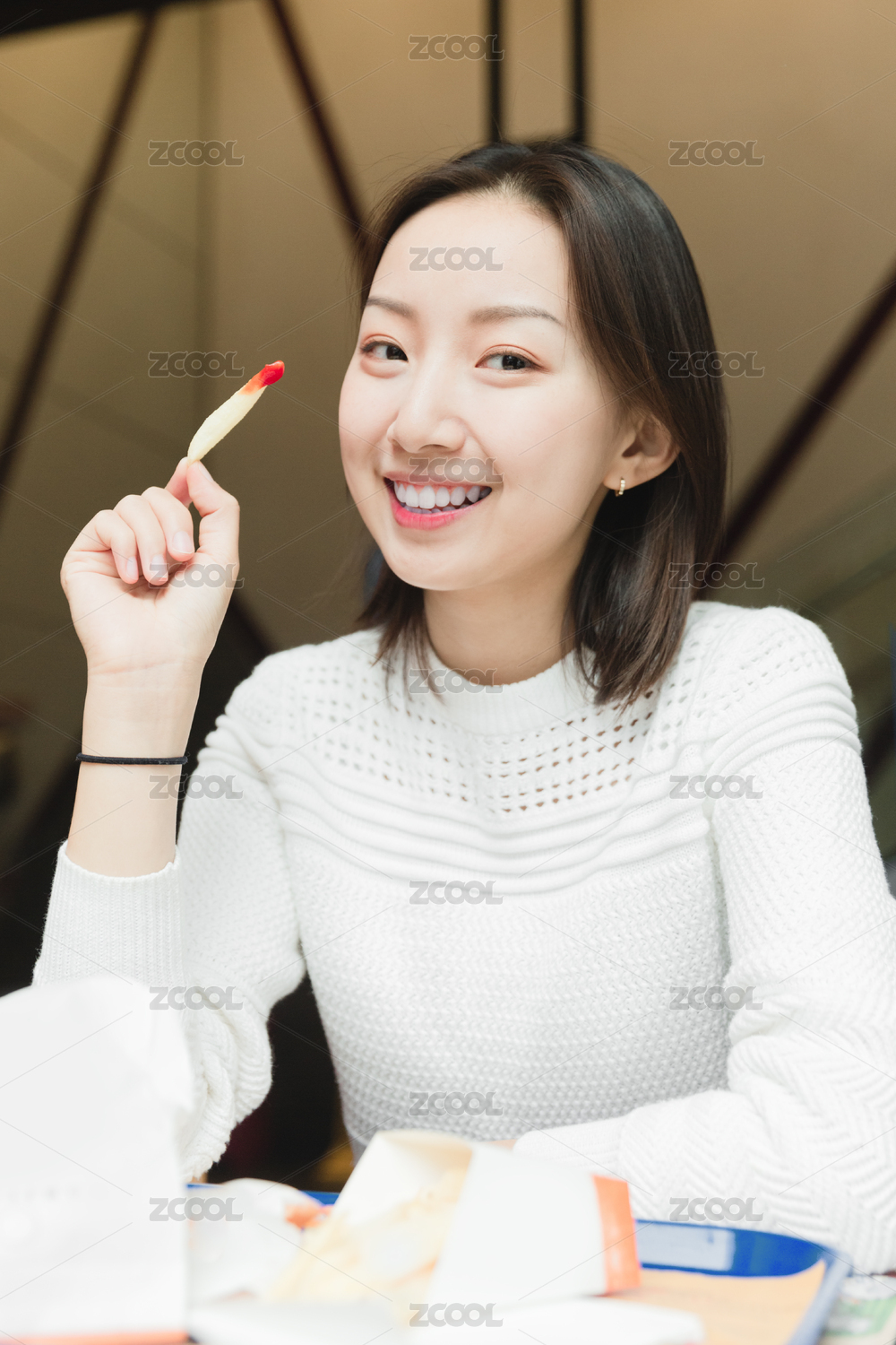 坐在餐廳吃快餐的中國(guó)女孩手拿一根薯?xiàng)l