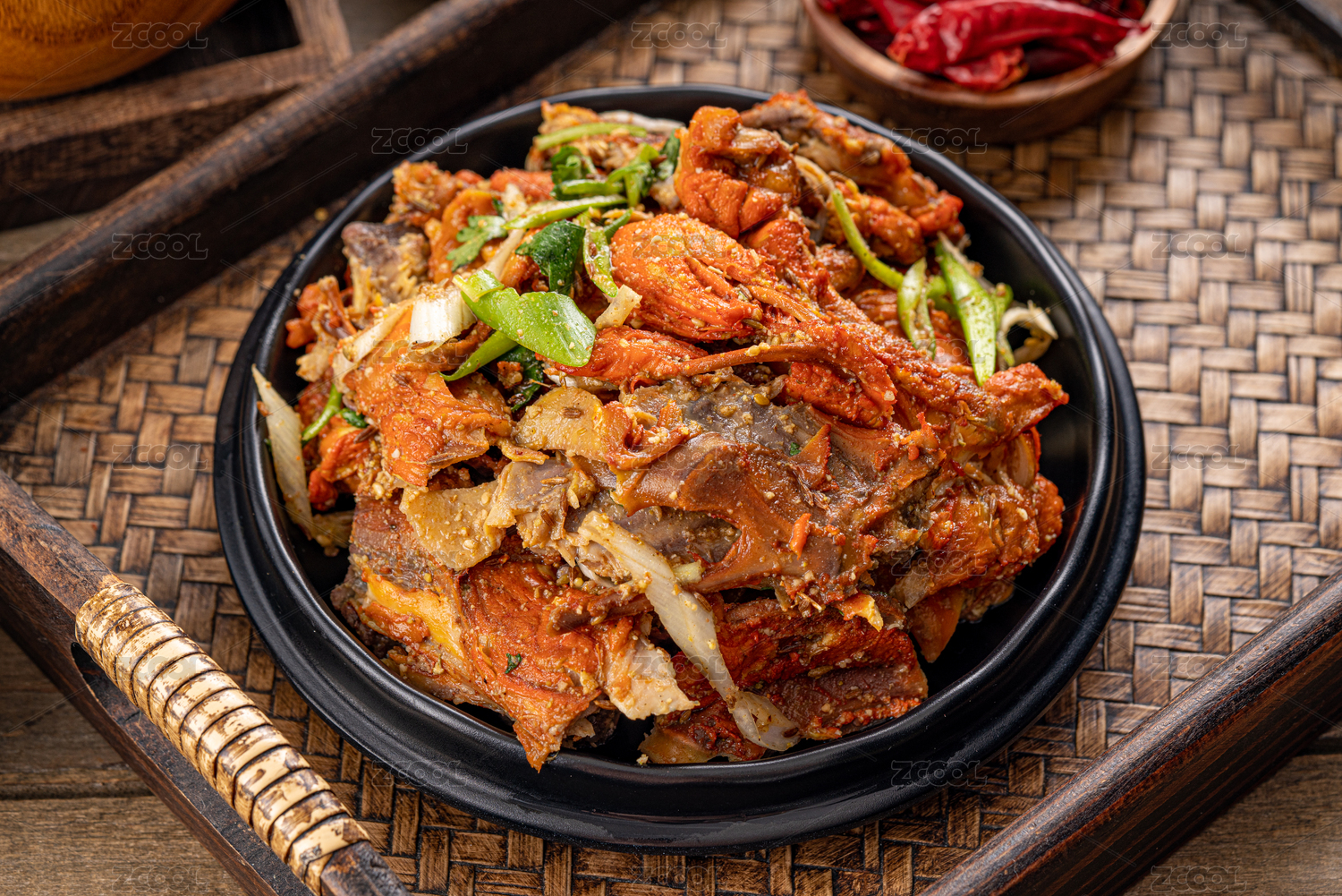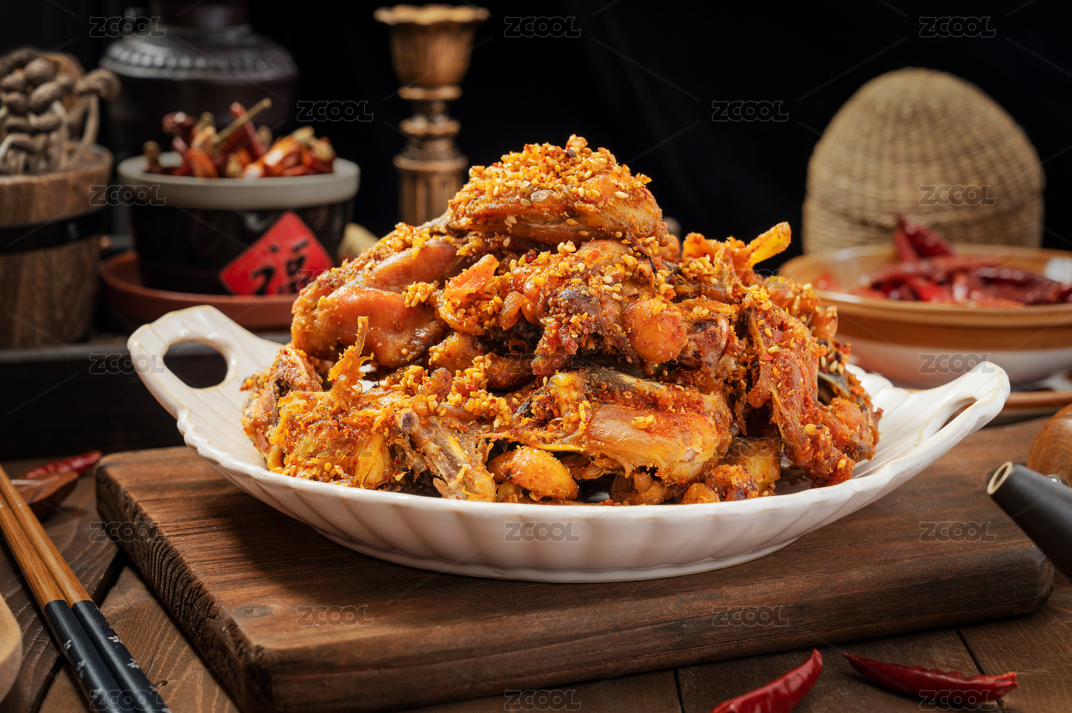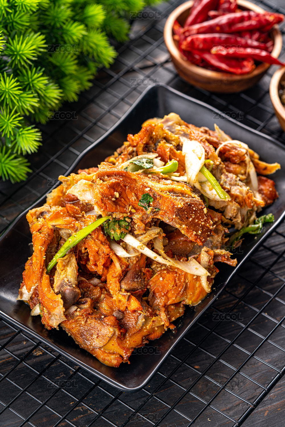 深色木板上擺放的麻辣雞架