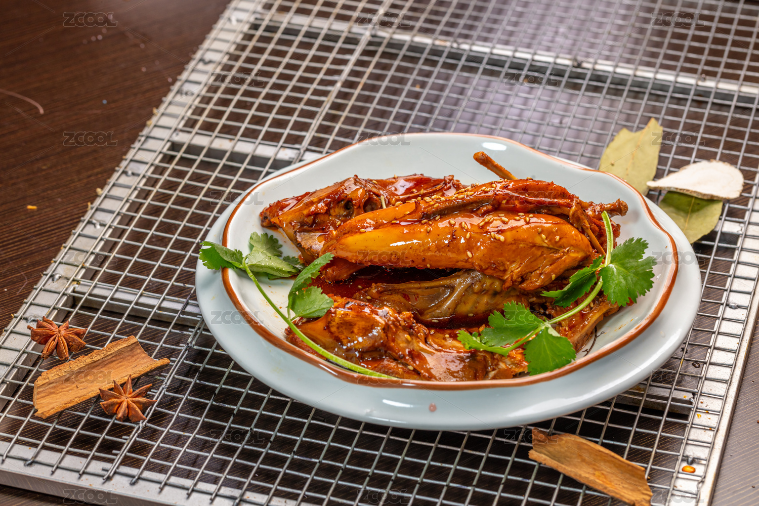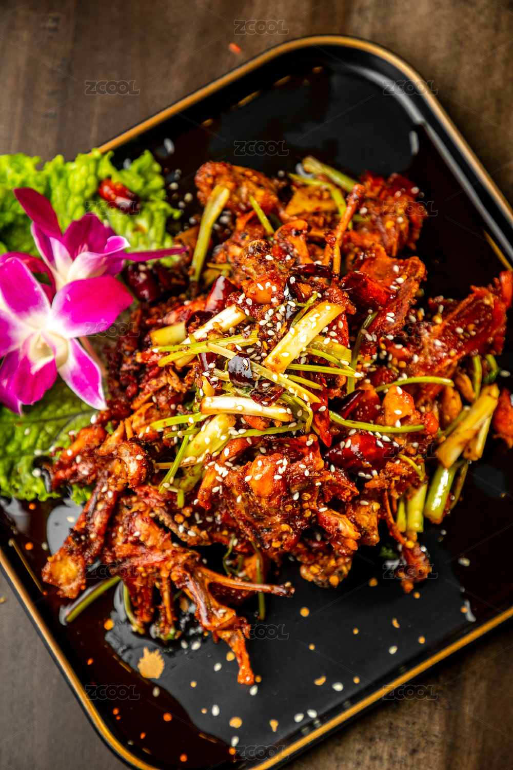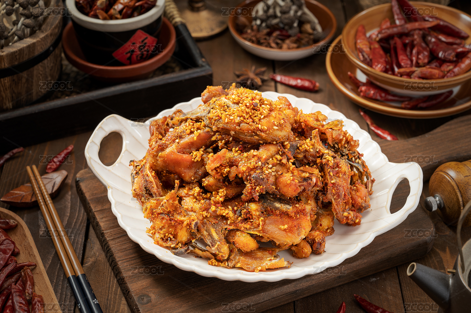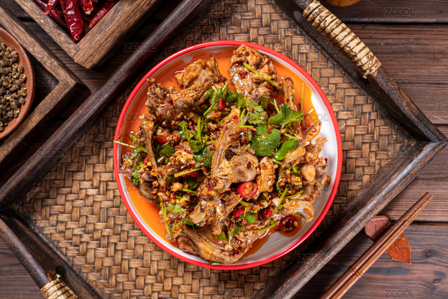 深色木板上擺放的麻辣雞架
