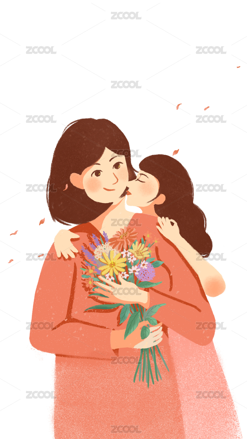母親節(jié)女兒親吻捧花的母親溫馨扁平插畫(huà)