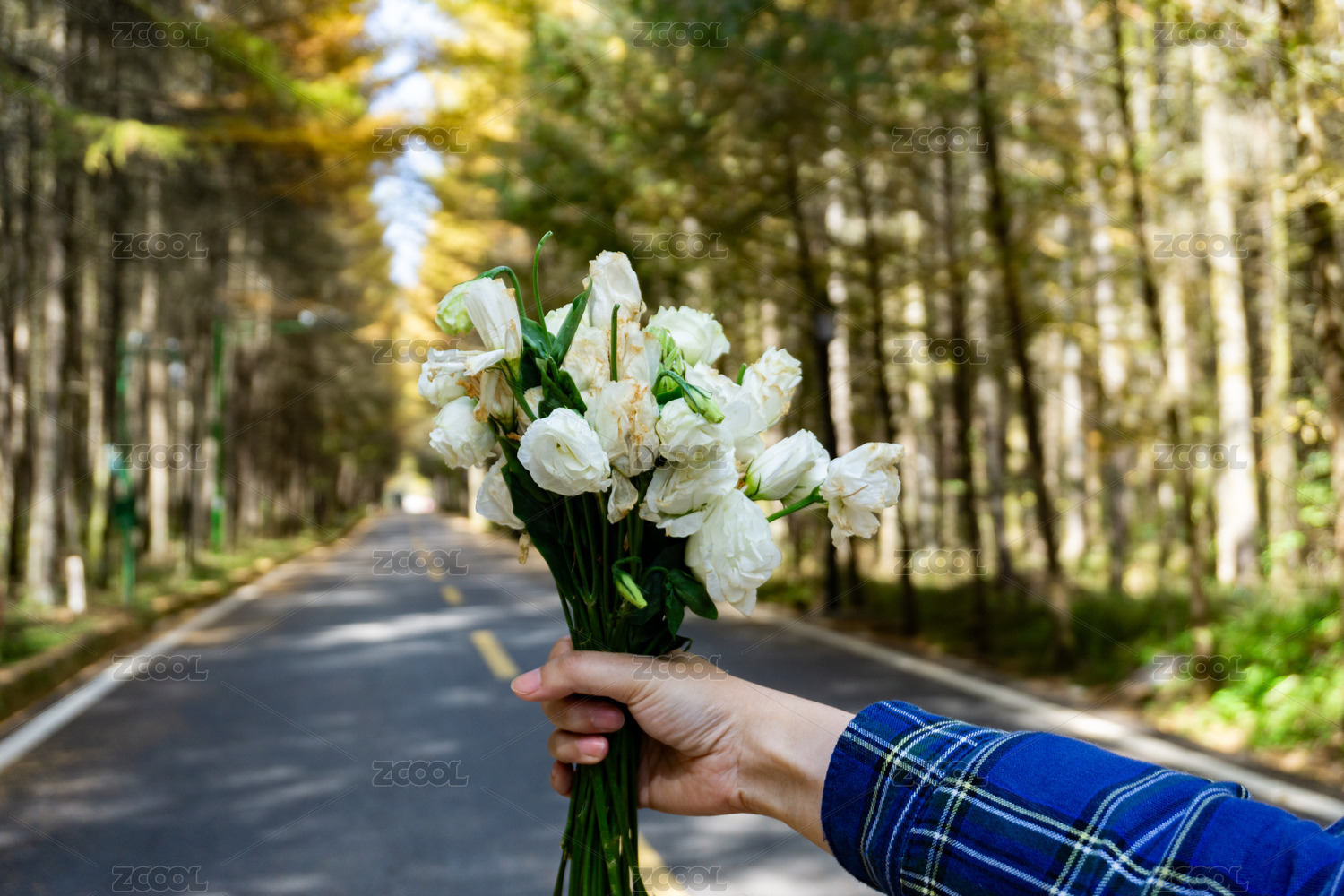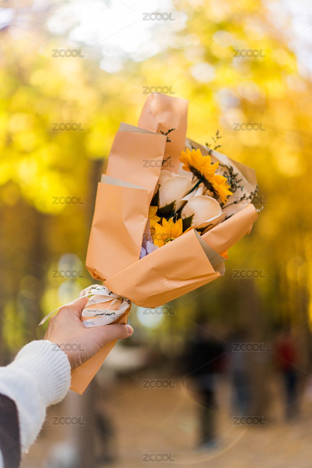 手捧花束的特寫(xiě)銀杏林背景