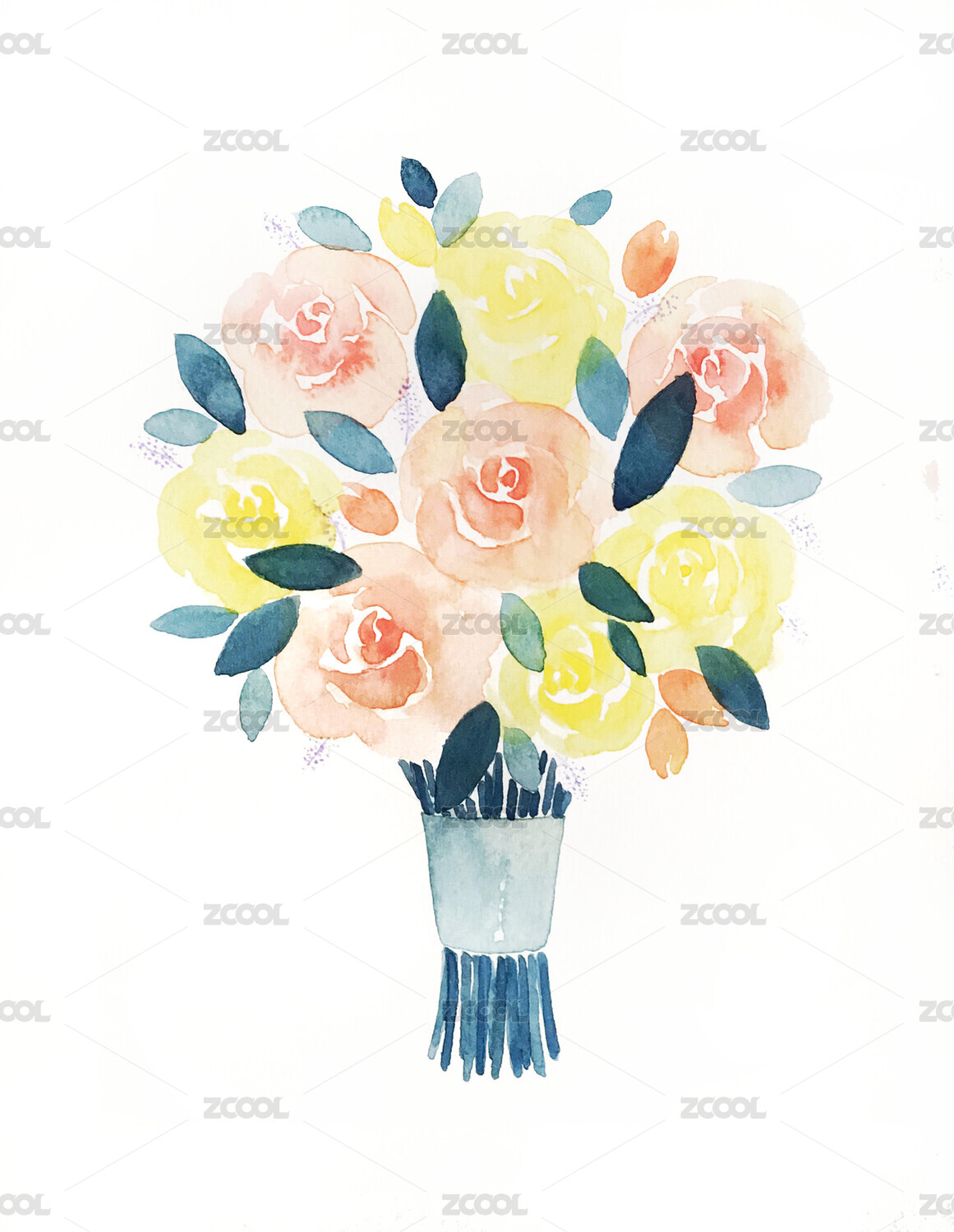 水彩手繪玫瑰捧花花束