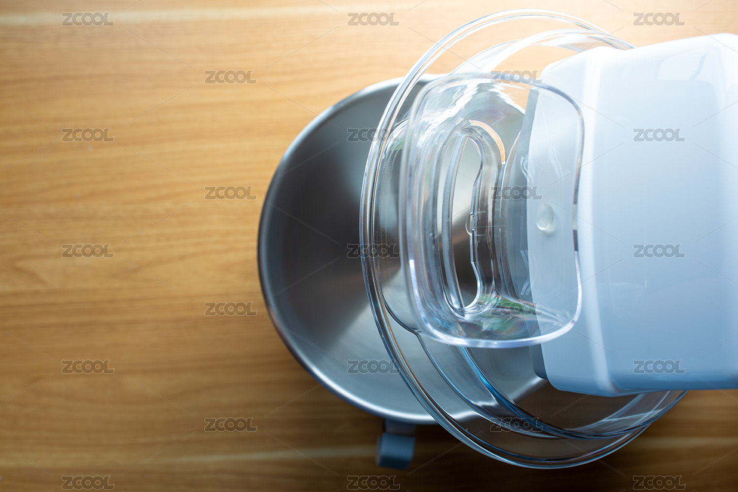 攪拌機(jī)的透明蓋子和金屬碗在木質(zhì)桌面上